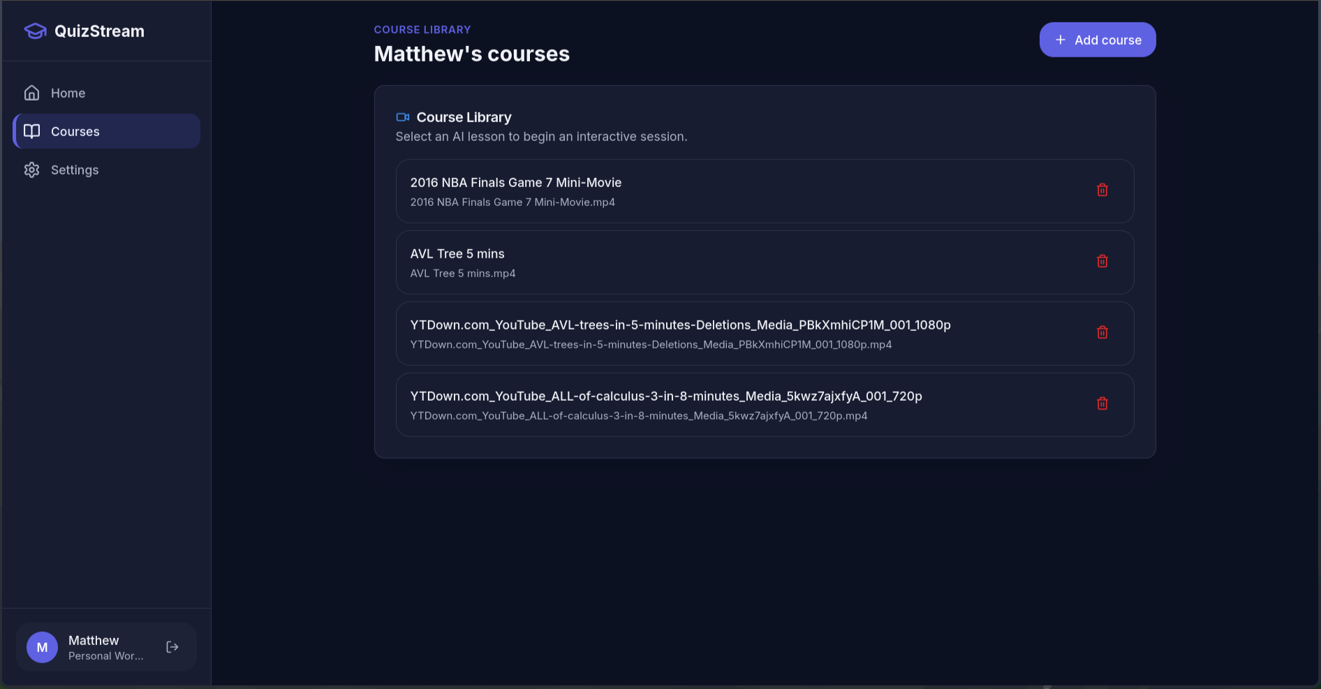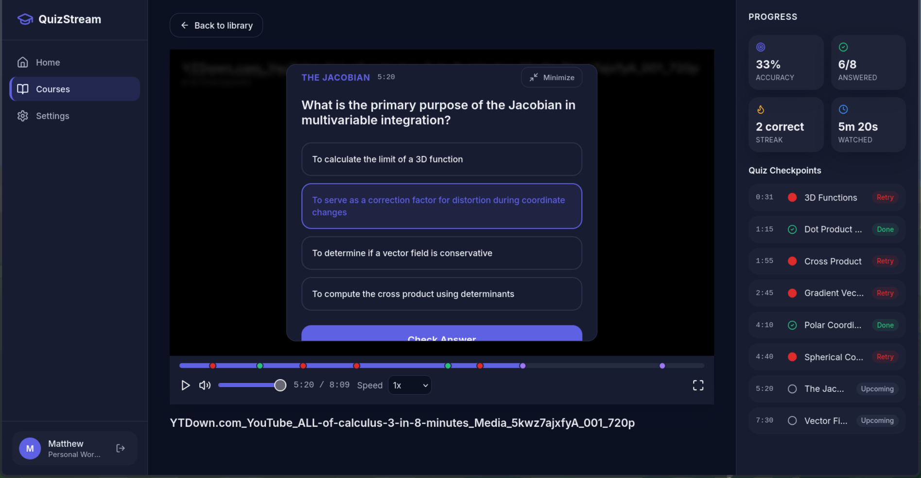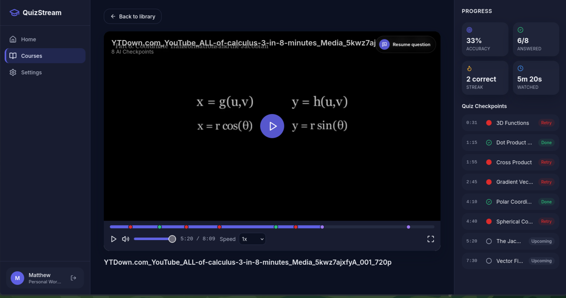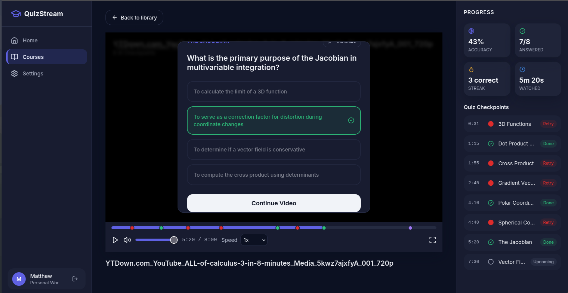Given a user-uploaded video, Quiz Stream uses Twelve Lab and Google Gemini to create an integrated quiz that tests the user as they watch the lecture.