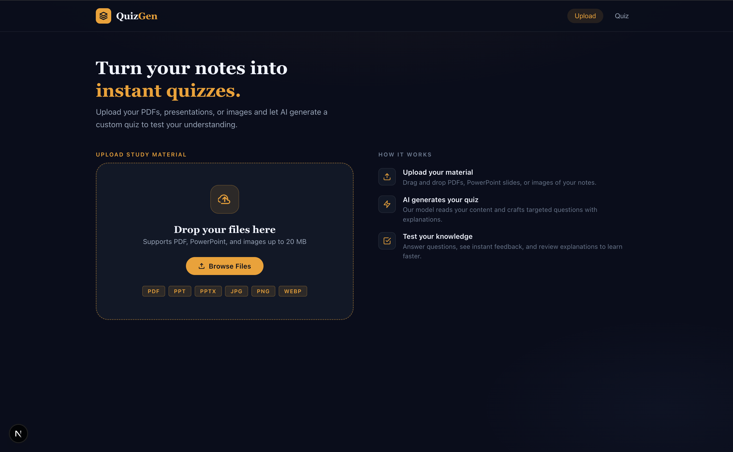 Students often read lecture slides passively without knowing what to focus on, and existing quiz tools either generate low-quality questions or rely on manual input. We wanted to build something that turns unstructured learning material directly into an active learning experience.