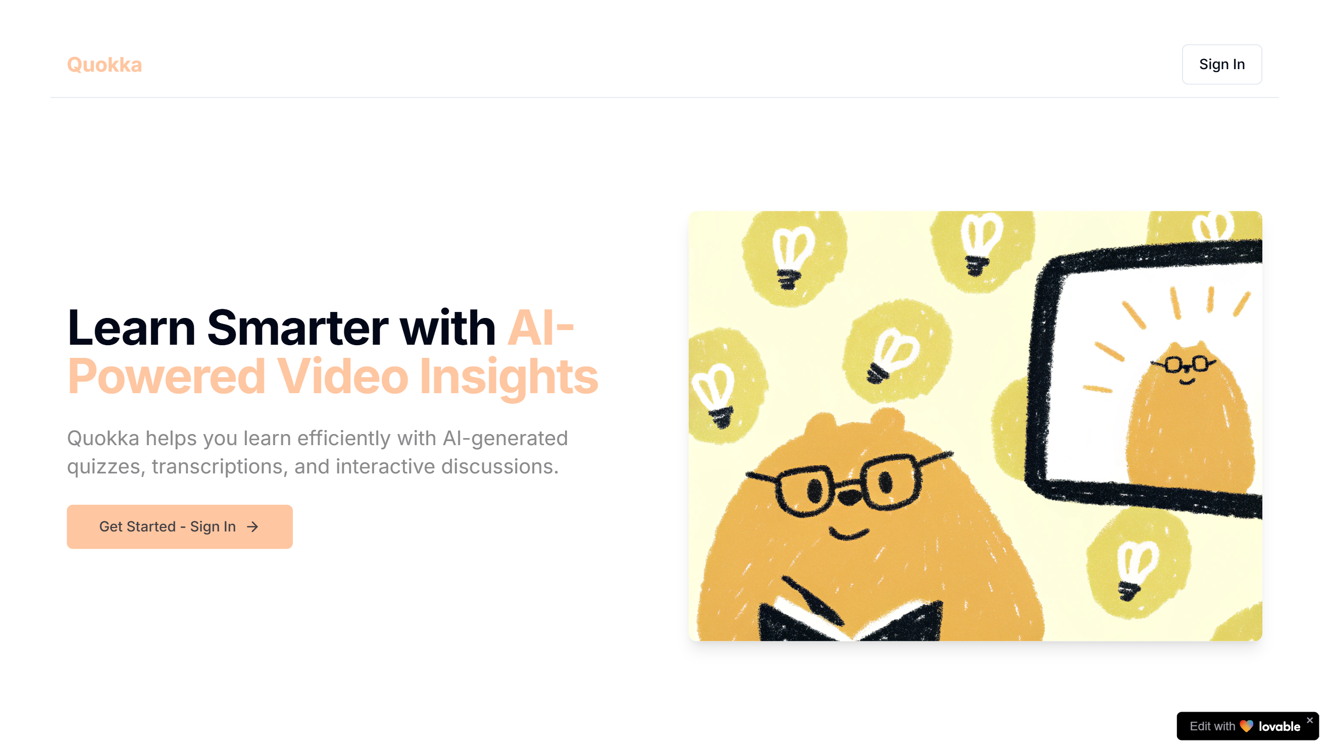 The ladning page features our friendly Quokka mascot, highlighting our AI-powered video learning platform with a clean, modern design.