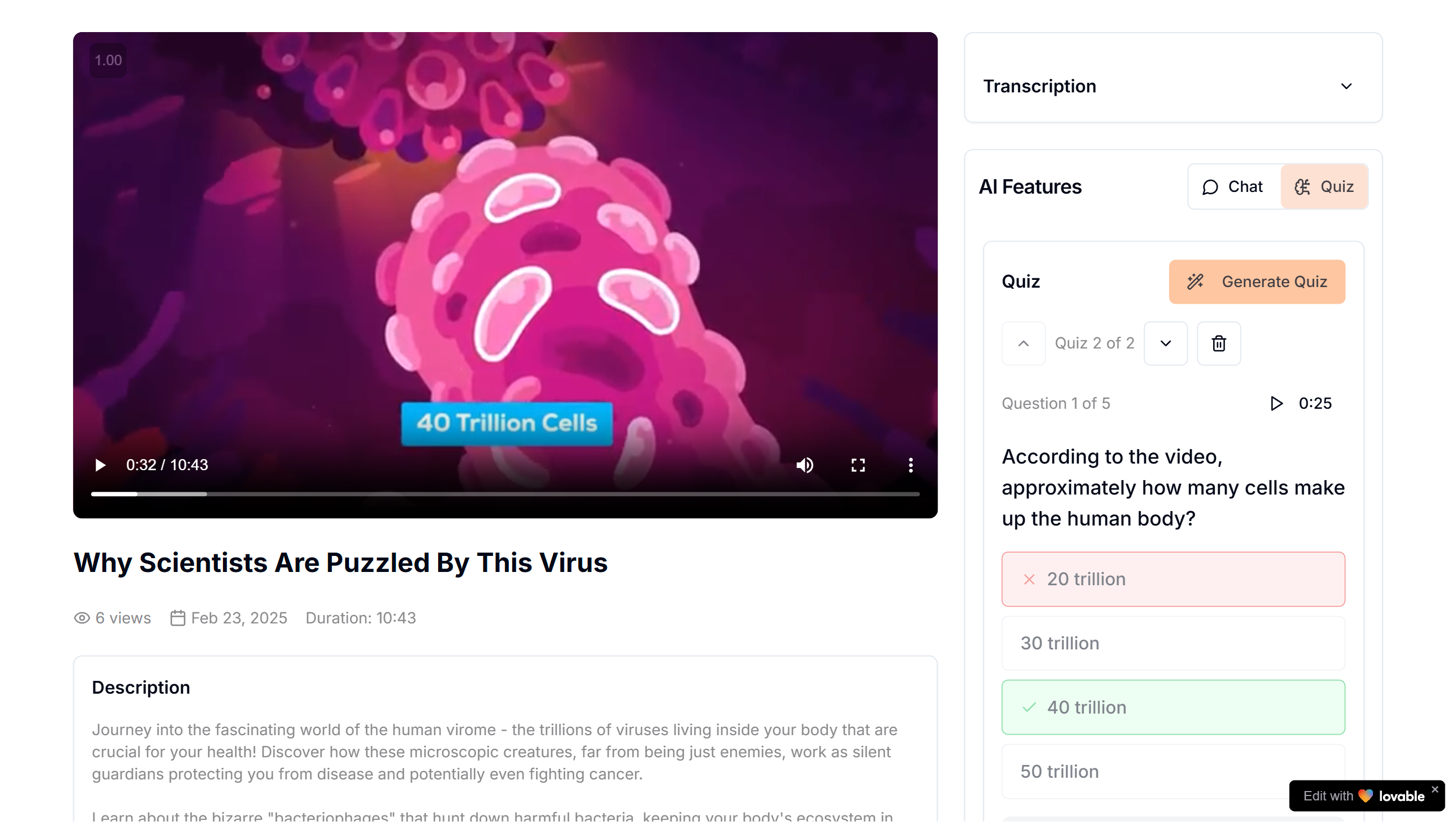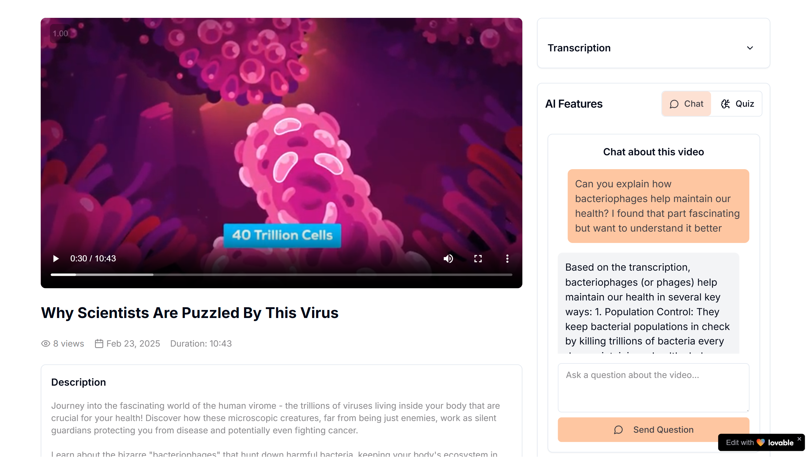 The project was born from a common challenge in online education: making video content more interactive and effective for learning. Traditional video platforms lack the tools to help students actively engage with the material and test their understanding in real-time. We saw an opportunity to use AI to transform passive video watching into an active learning experience.