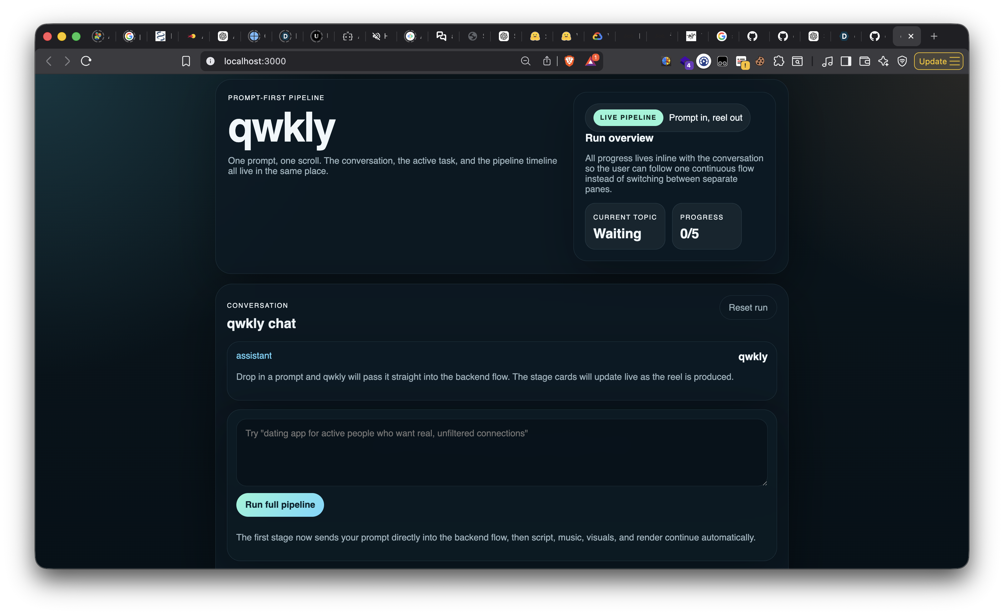 The idea was to compress that whole workflow into one prompt and one continuous agent experience. A user describes the concept, and qwkly handles the rest: understanding the topic, writing the script, generating music, creating visuals, and assembling a finished vertical video.