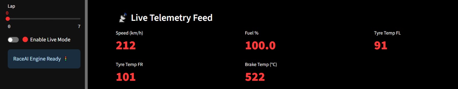 - Telemetry alerts (fuel, tires, brakes)