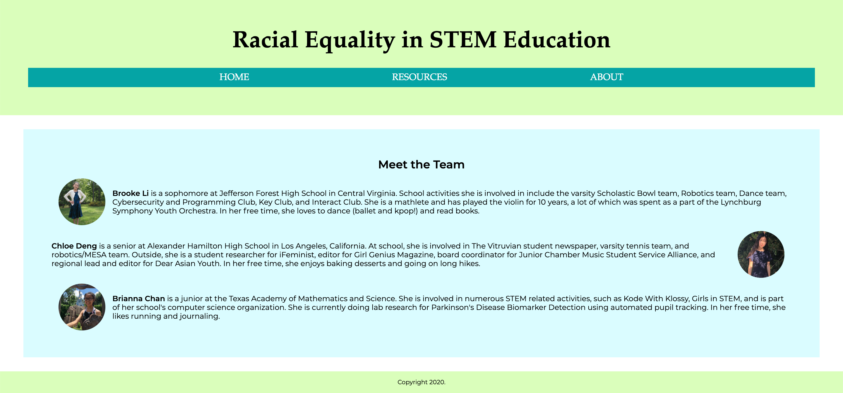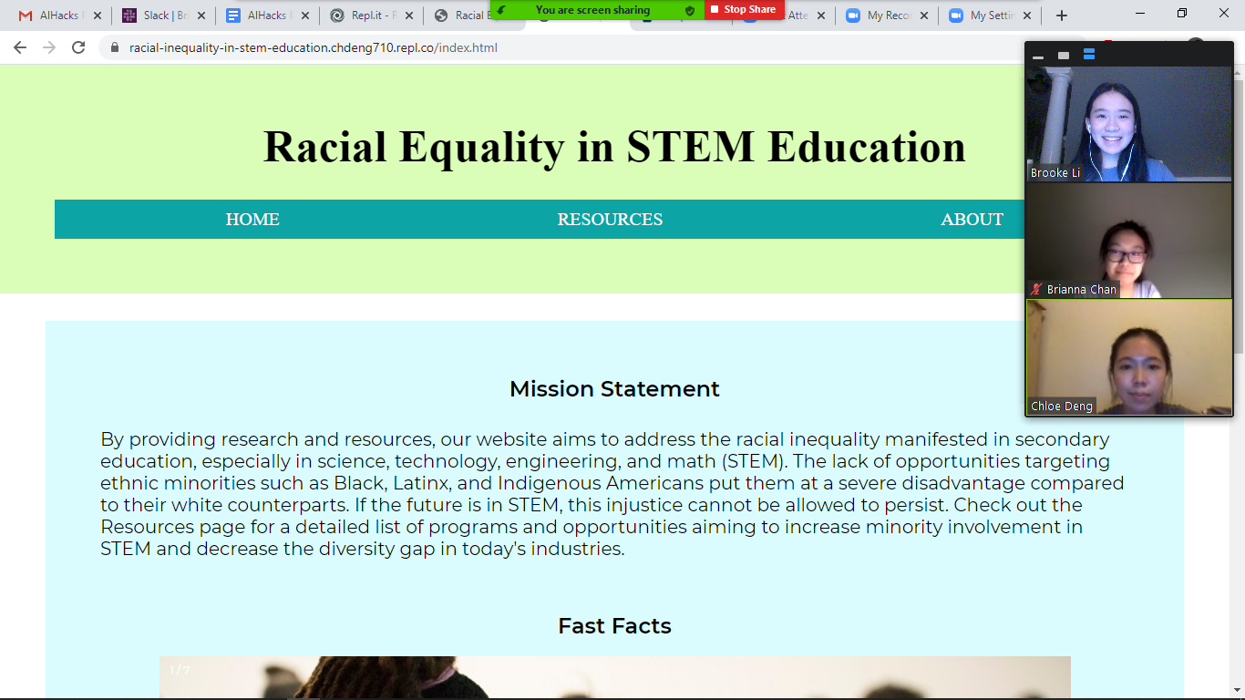 When we first met up as a group, we each brainstormed a list of issues we were passionate about, the top two being racial equality and education access. We then decided, why not, to merge those two issues and bridge them together using STEM. As women coders, we know firsthand how it feels to be placed in a male-dominated industry. In creating this website, we hope to inspire other underrepresented groups to explore and get involved so that we can work towards a more diverse and inclusive future in STEM.