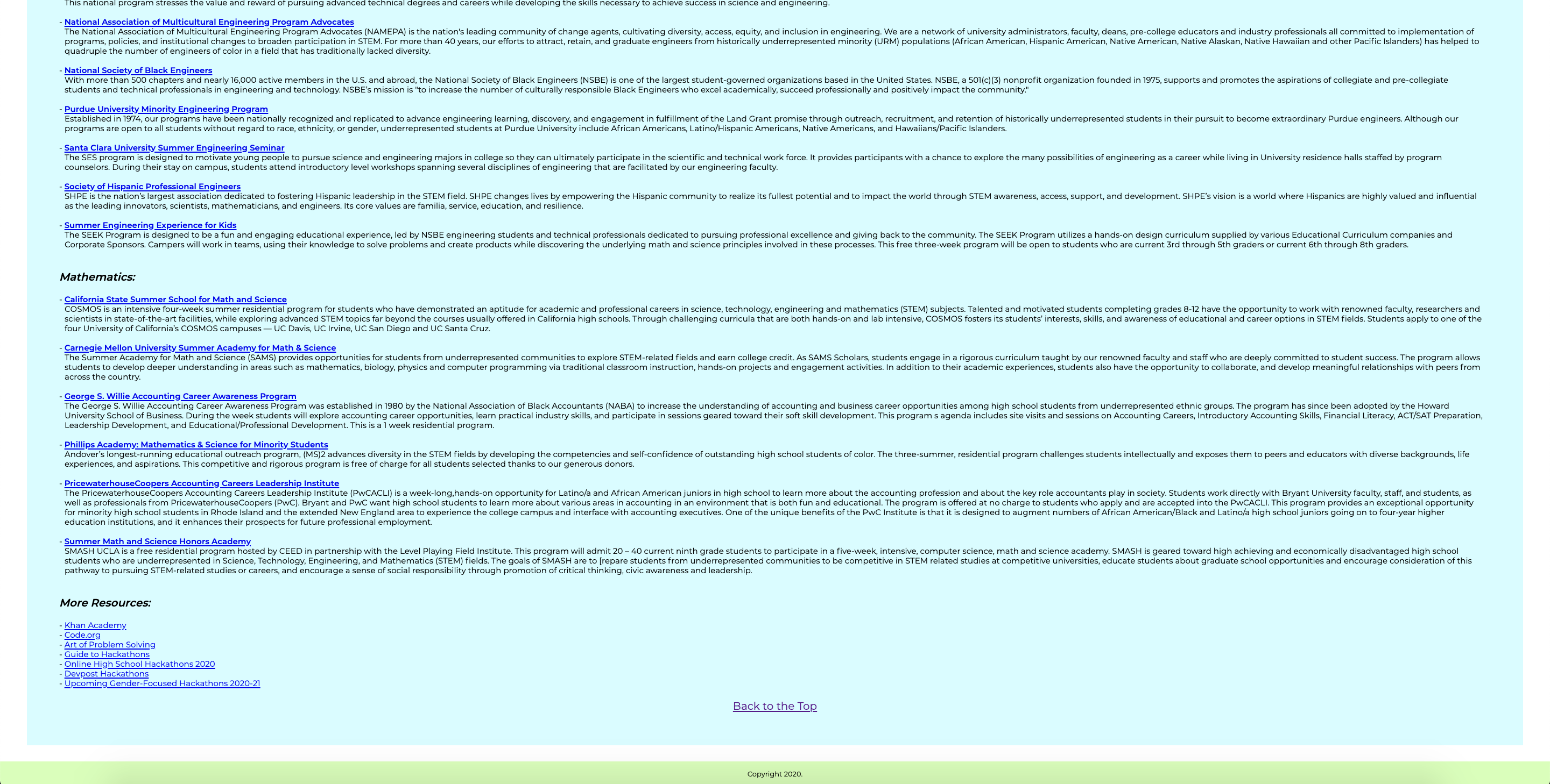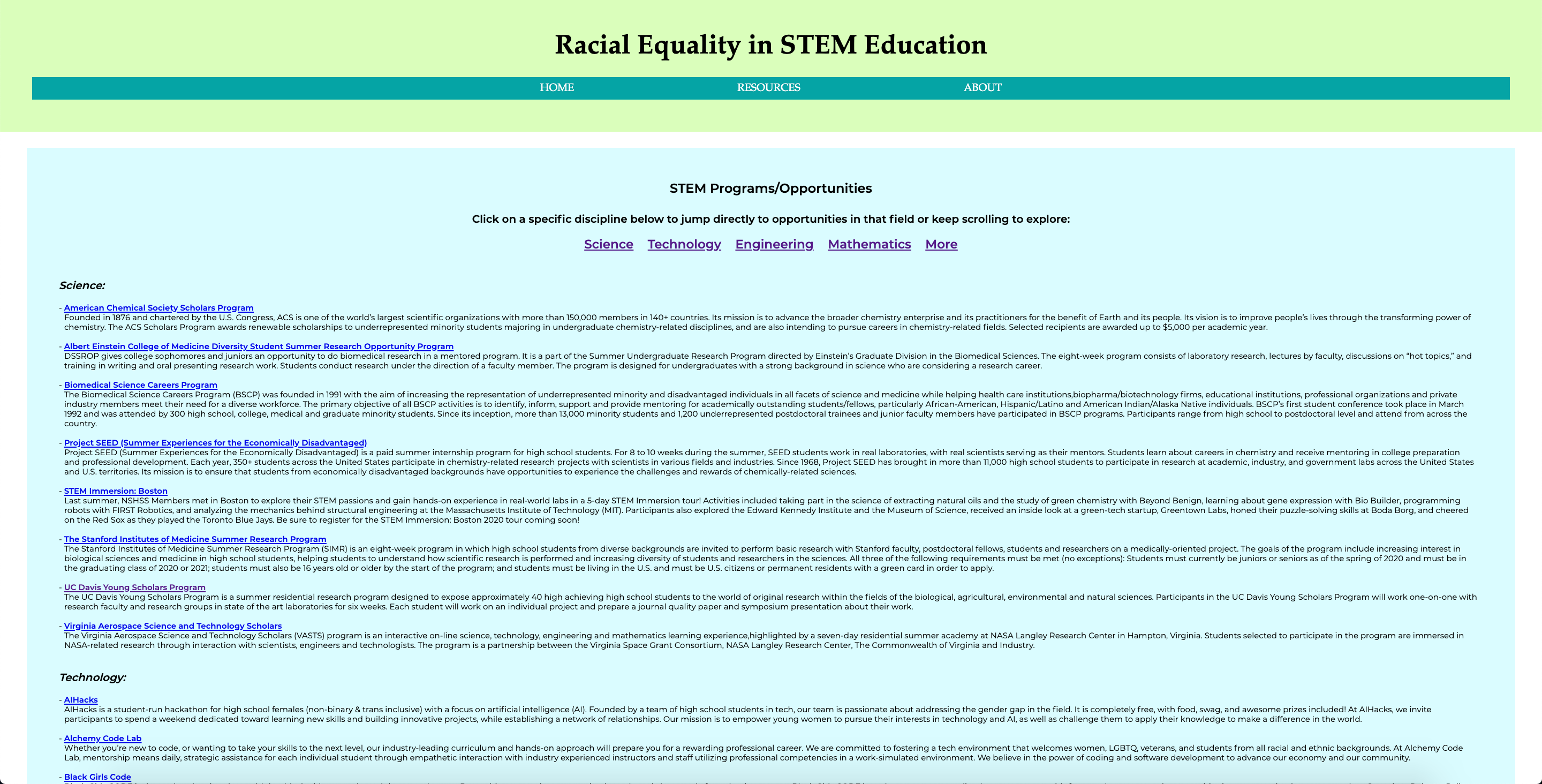 When the user is finished learning the background, they can head over to the Resources Page via the navigation bar. Here they will find a comprehensive list of STEM opportunities catered towards middle and high schoolers from underrepresented communities. The page is split up into sections (Science, Technology, Engineering, and Mathematics), with page jump links located at the top if the user has a specific discipline in mind. If not, one can simply scroll down to read each program and its description. Each program heading on the page is embedded with the program’s website link, so users can click on the heading if they want to learn more or apply.