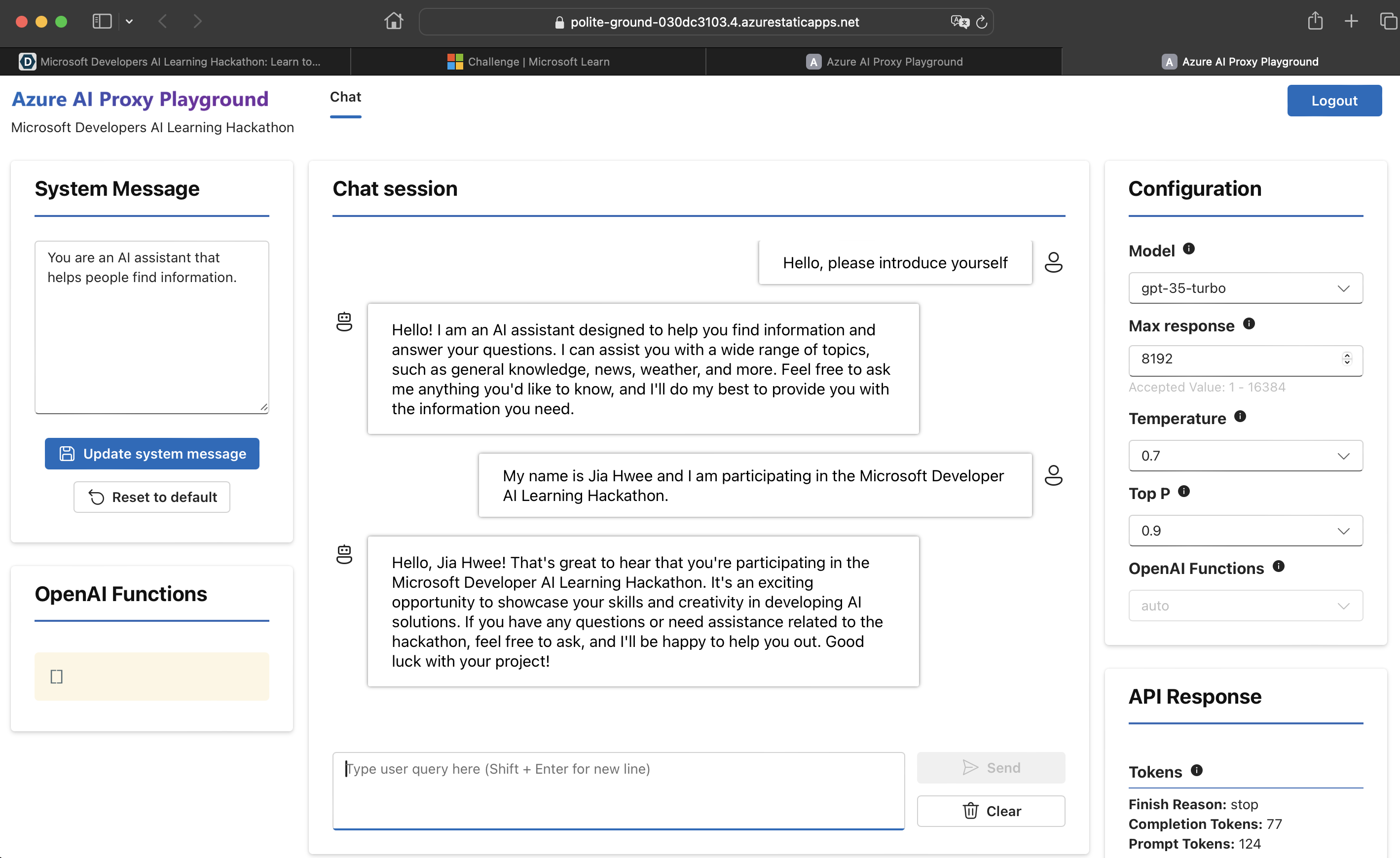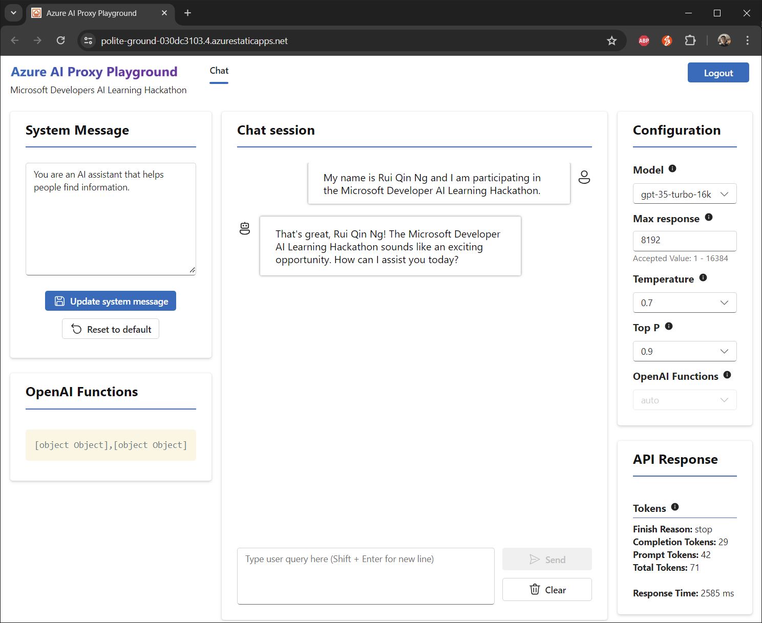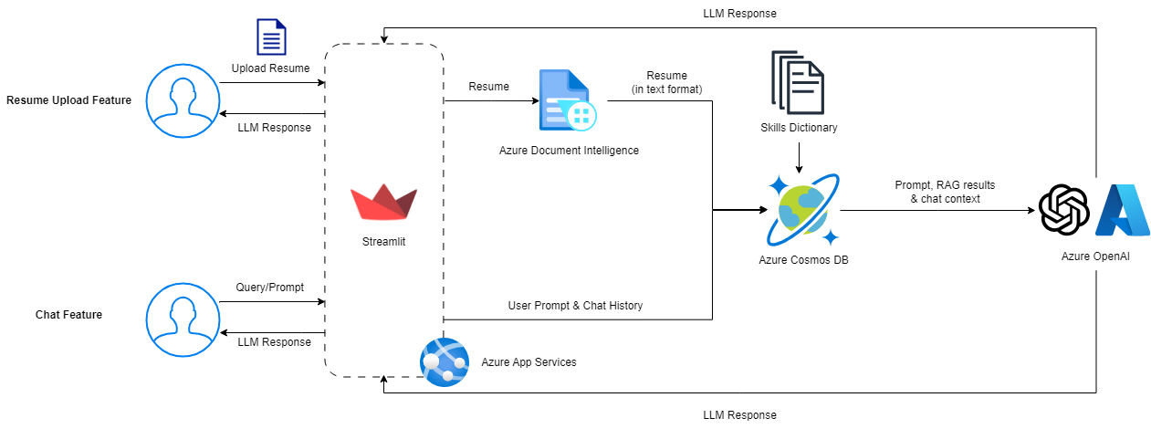 - Azure OpenAI (ChatGPT 3.5 Turbo 16k) to identify and infer skills from the prompt, results from the RAG and chat context