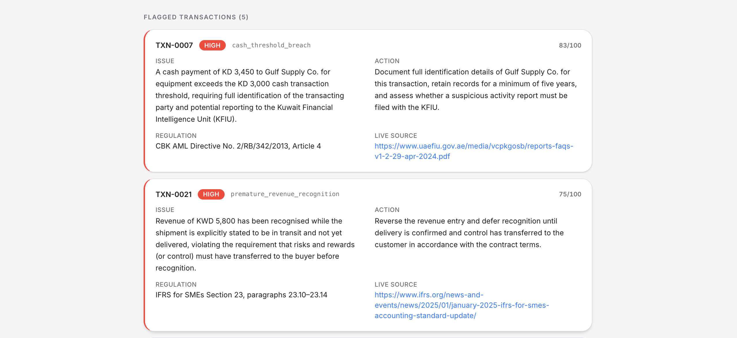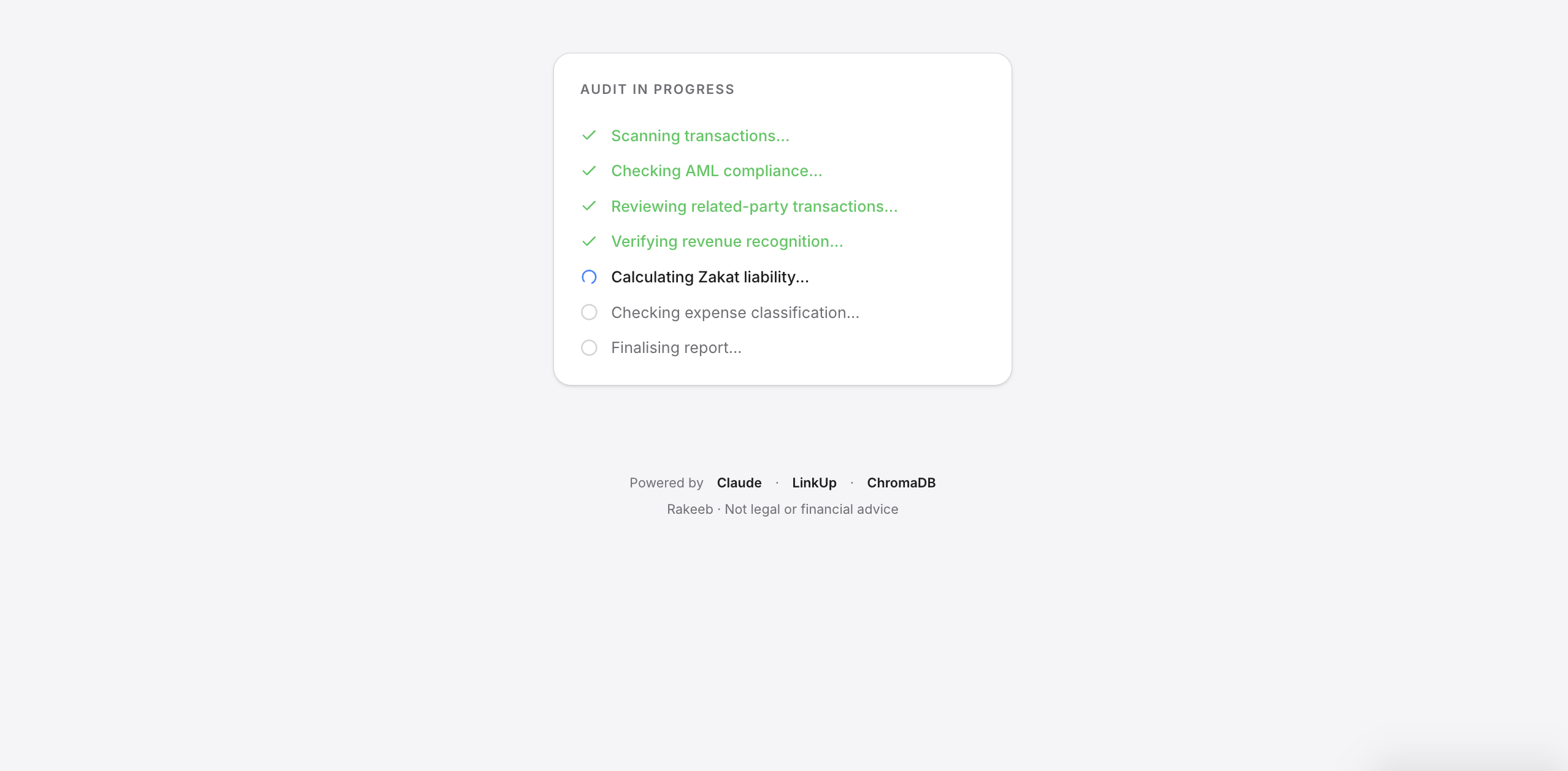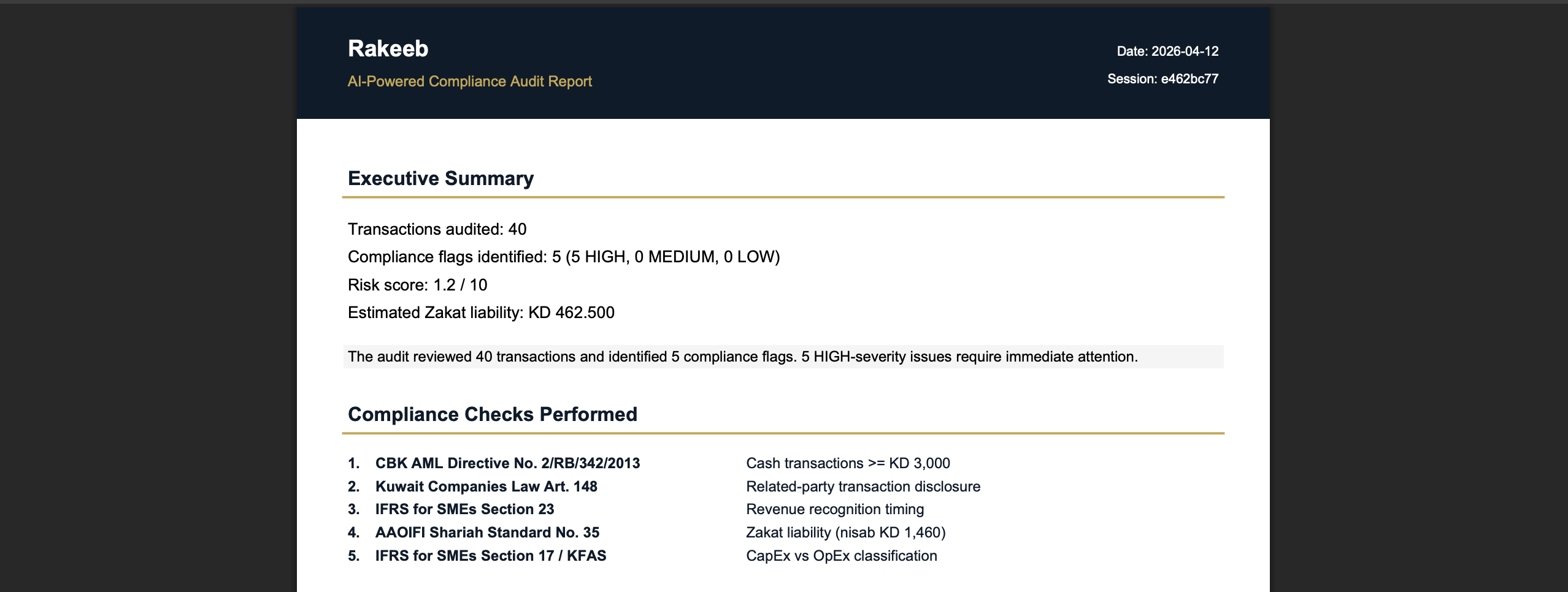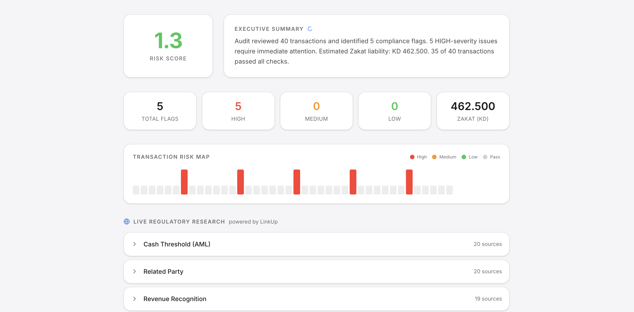 We built an AI that knows the regulations — AML directives, IFRS standards, Zakat rules, Companies Law — and can read your transaction ledger the way a senior auditor would. But instead of two weeks and thousands of dinars, it takes 30 seconds and a CSV upload.