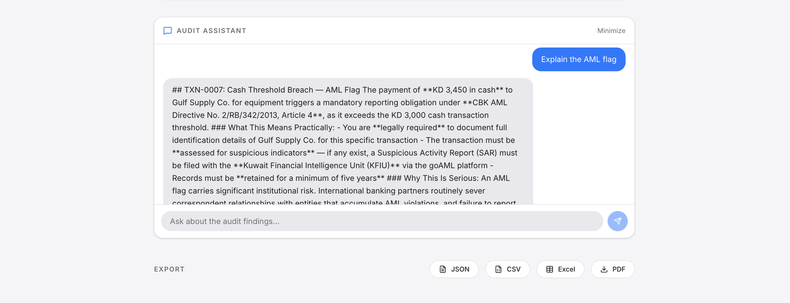 Every flagged transaction gets a confidence score, a cited regulation, and a plain-English action item. The report comes back as a color-coded Excel file — red rows need attention now, orange rows need review, green means you're clean. You can even ask follow-up questions in natural language: "Which flags should I fix first?"
