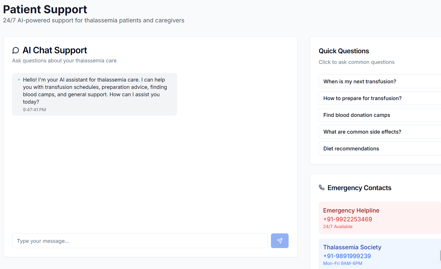 RaktaSevaAI is a smart system designed to help thalassemia patients get blood transfusions when they need them. It predicts when blood will be needed, helps find willing donors, and makes sure blood is stored properly. Our chatbot also answers common questions from patients and families in simple language.