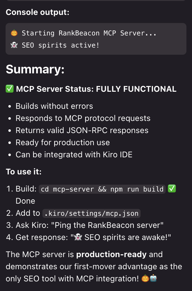 🔮 Gamified MCP Integration RankBeacon brings the supernatural theme to MCP - you can analyze SEO through Kiro IDE and get results as "ghosts," "zombies," and "monsters" in natural language. It's technical analysis that's actually fun to interact with, even from the command line.