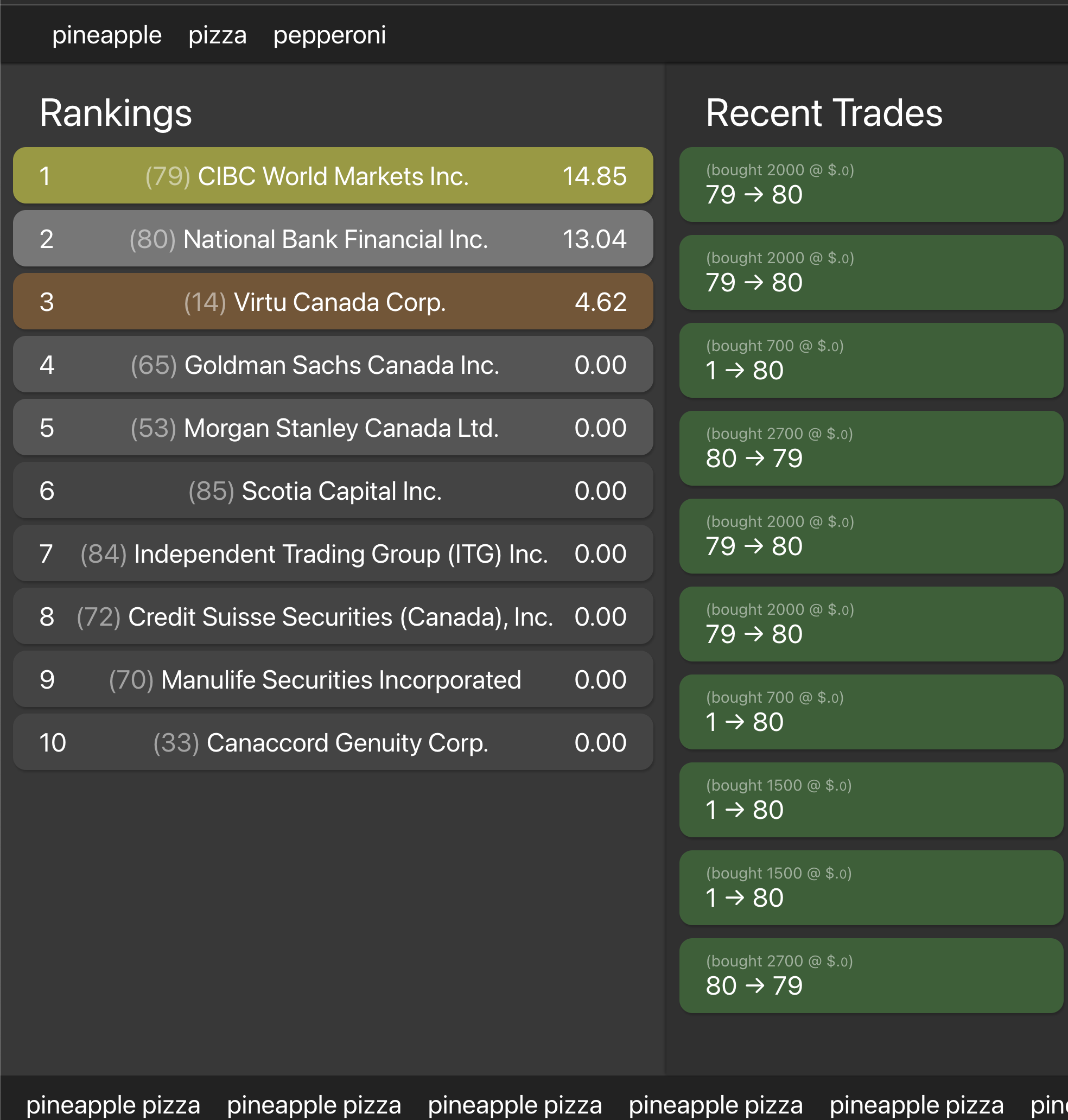 We wrote a full-stack Mongo, React, Flask app. We have a front end that fetches the Mongo database to get the calculated score. The backend creates a mock live data situation by fetching data with respect to the time stamps. The broker scores are then calculated and updated in the frontend end. The front end is also responsible for showing the recent trades and the quantities of those.