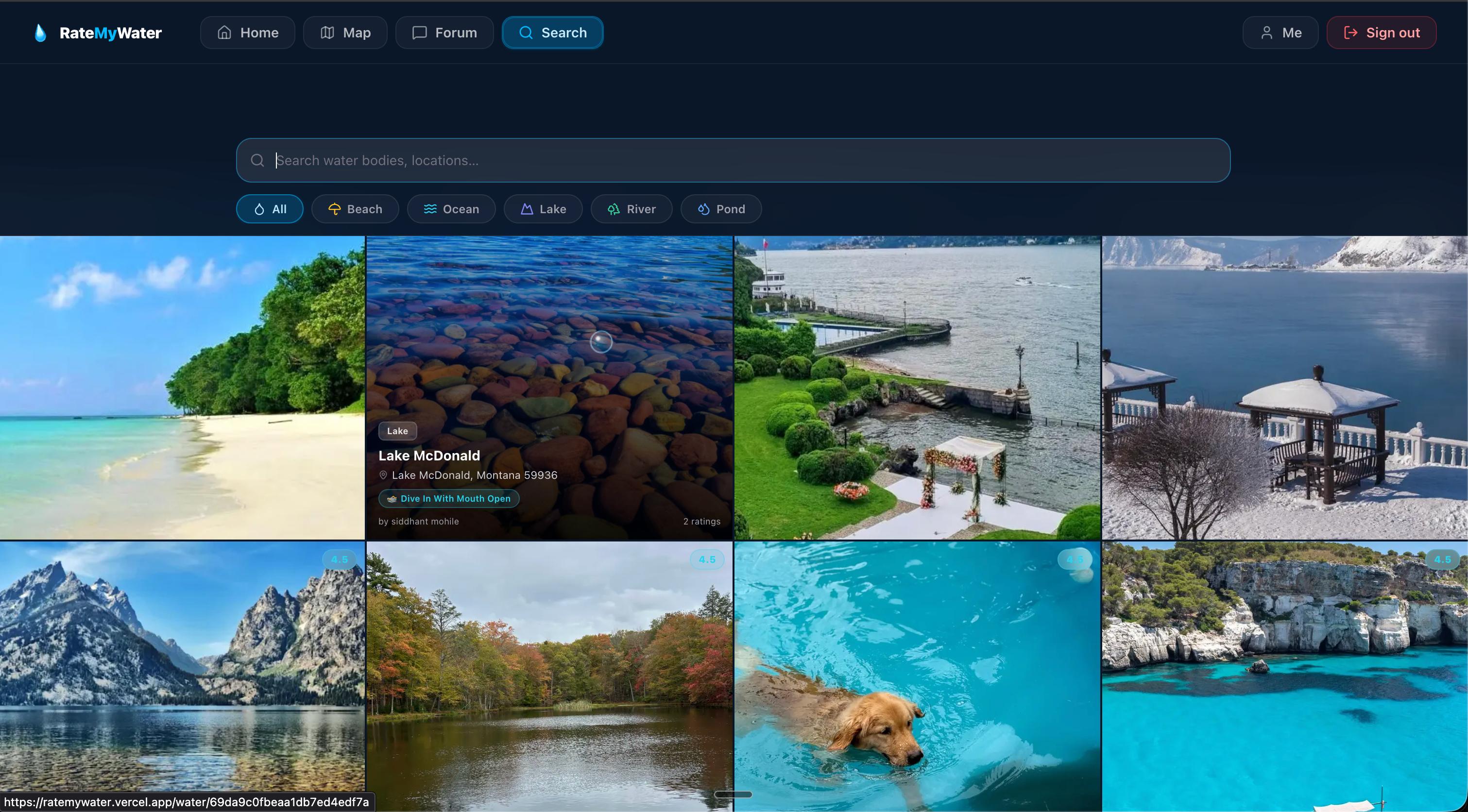 RateMyWater lets anyone rate and review any body of water in the world — rivers, lakes, beaches, ponds, oceans — on a scale from Dive In With Mouth Open (5/5) to Biohazard Speed Run (1/5). Users can submit a water body, leave a review, browse an interactive map showing safety ratings at a glance, and search for any water body using smart autocomplete. It's a community-powered water safety platform that gives people honest, human answers to one simple question: can I get in this?