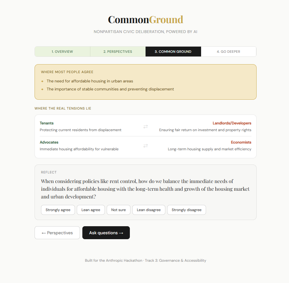 CommonGround came from a simple frustration: most people encounter public-policy debates as heat before light. It is easy to find the loudest opinion in a room and much harder to understand why reasonable people disagree in the first place. We wanted to build something that slows that process down and helps users explore competing values, tradeoffs, and shared concerns before they lock into a side.