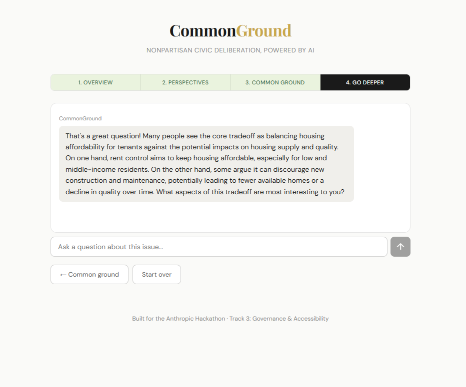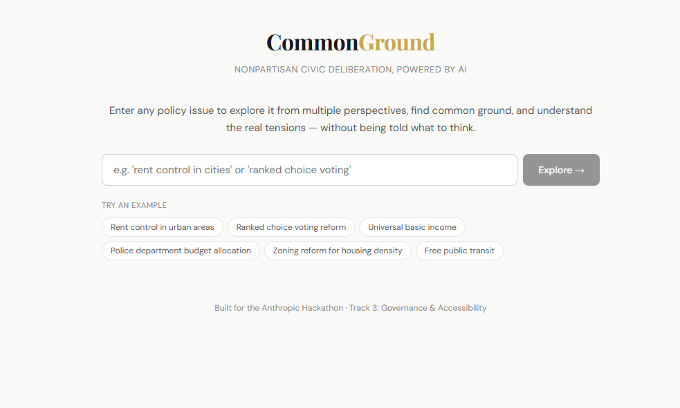 CommonGround is an AI-powered civic deliberation platform. A user enters a policy issue, and the app guides them through a structured, nonpartisan exploration of that topic.