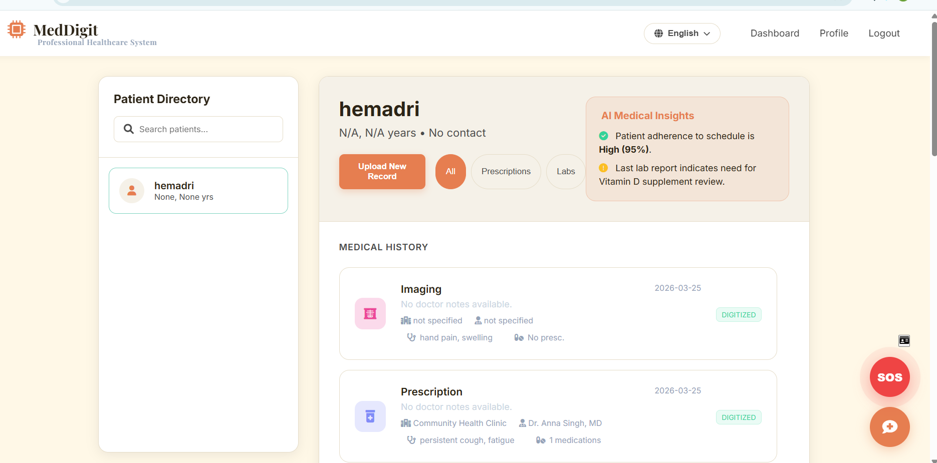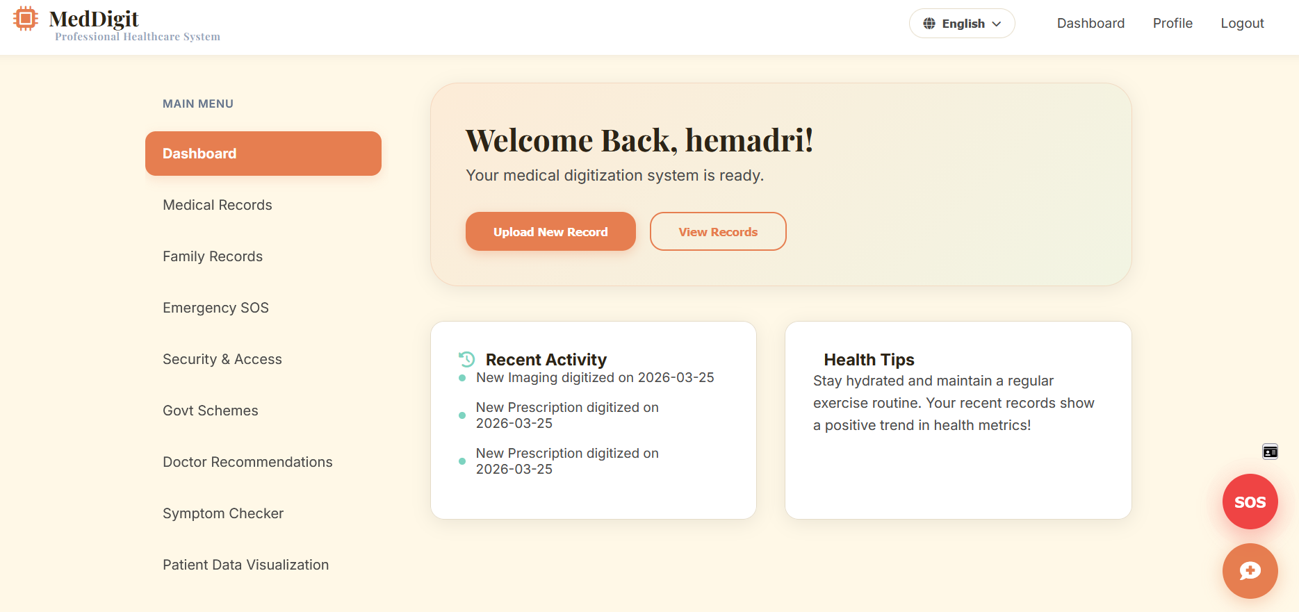 MedDigit AI is a real-time medical digitization and emergency support system that: 🚑 Provides one-tap SOS and real-time ambulance tracking 📂 Converts medical reports into digital records using OCR + AI 🤖 Offers AI-based symptom checking, disease detection, and chatbot assistance 📊 Visualizes patient health data and tracks trends over time 🔐 Ensures secure access with role-based authentication 👨👩👧 Manages family medical records 💊 Recommends government healthcare schemes It creates a connected and intelligent healthcare ecosystem.
