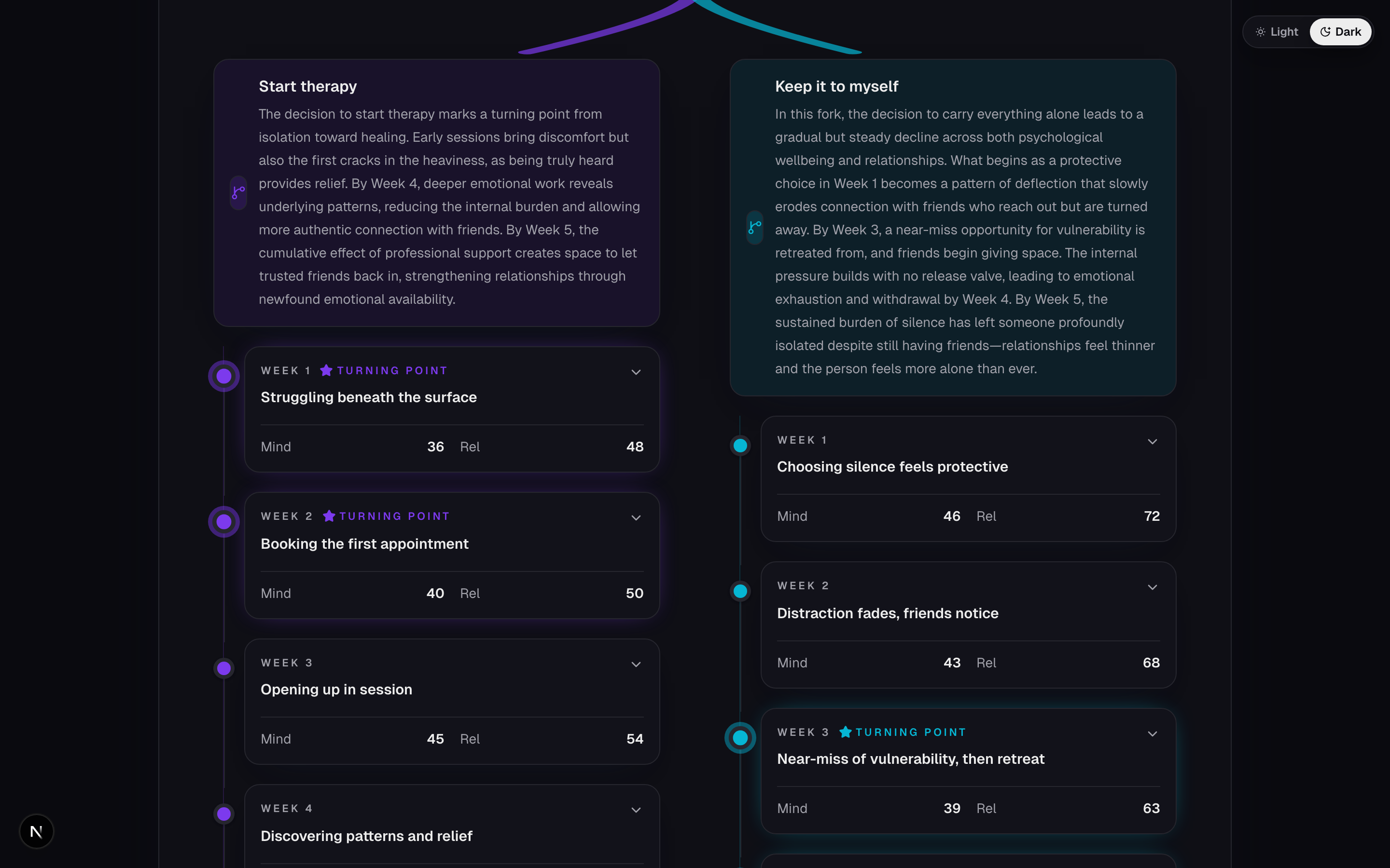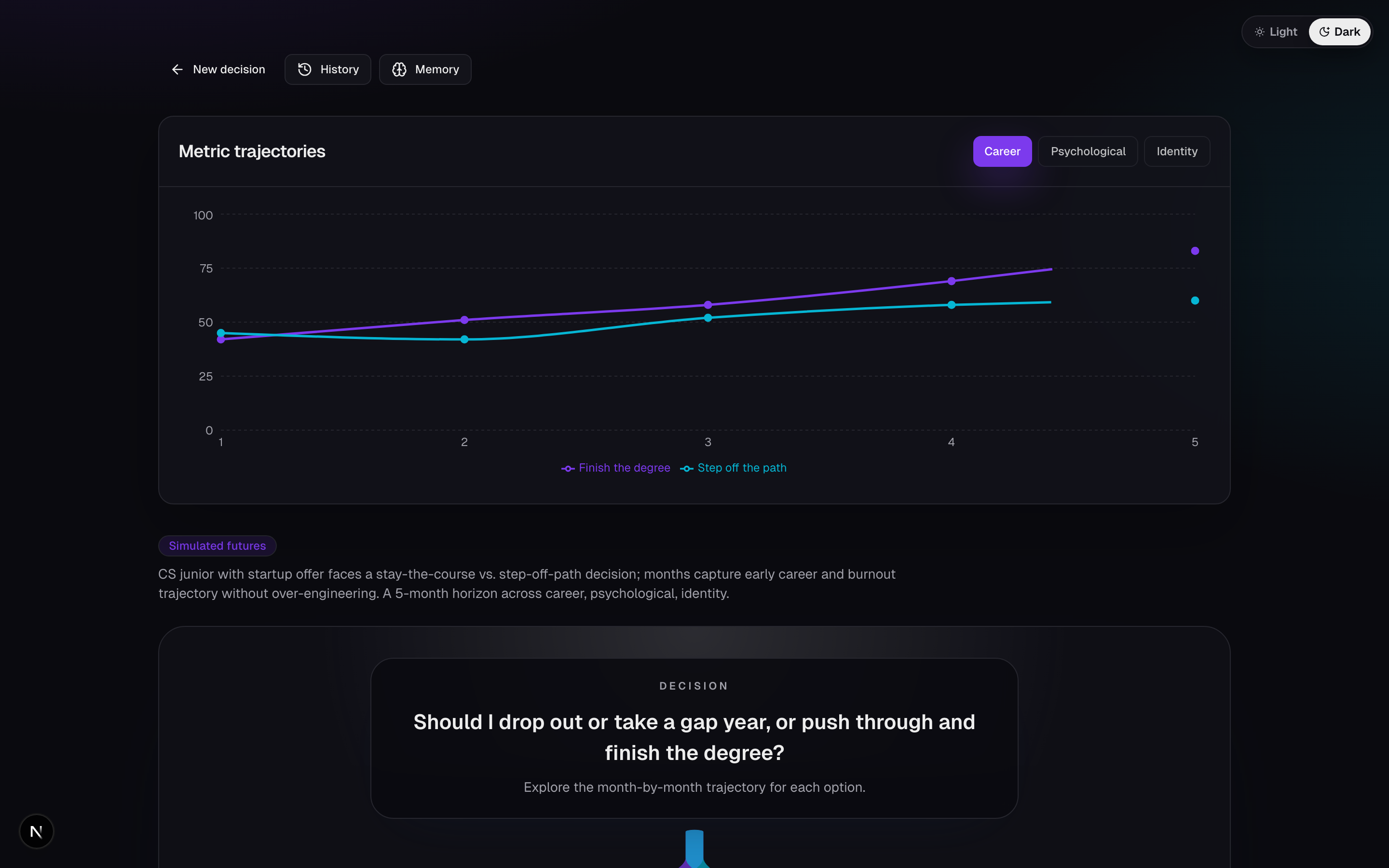 We also had to think hard about product design: how deep should a simulation go, how many forks are useful, when should the app ask follow-up questions, and how do we present speculative results responsibly?