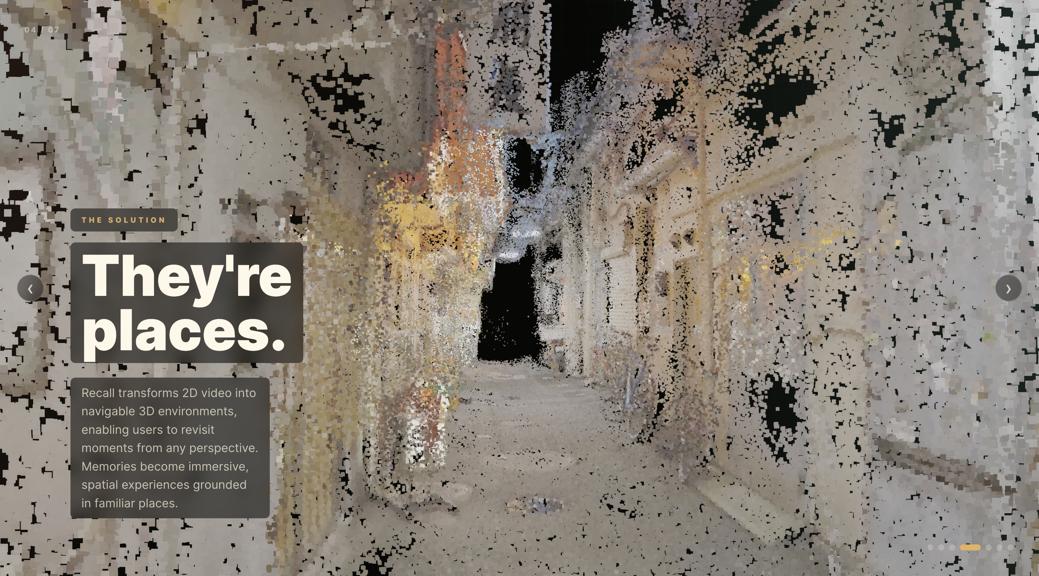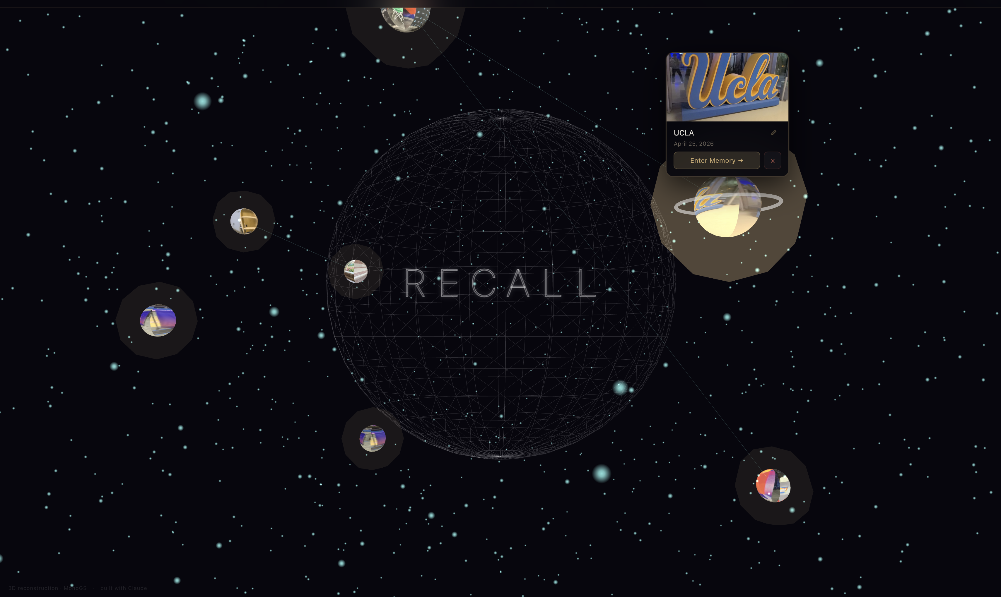 Recall turns any phone video into an interactive 3D space you can walk through in a browser. You film a place, upload it, and the system reconstructs it as a Gaussian Splat, which is a navigable point cloud you can orbit, walk around, and step back into. No cloud and no account, so your places stay yours.