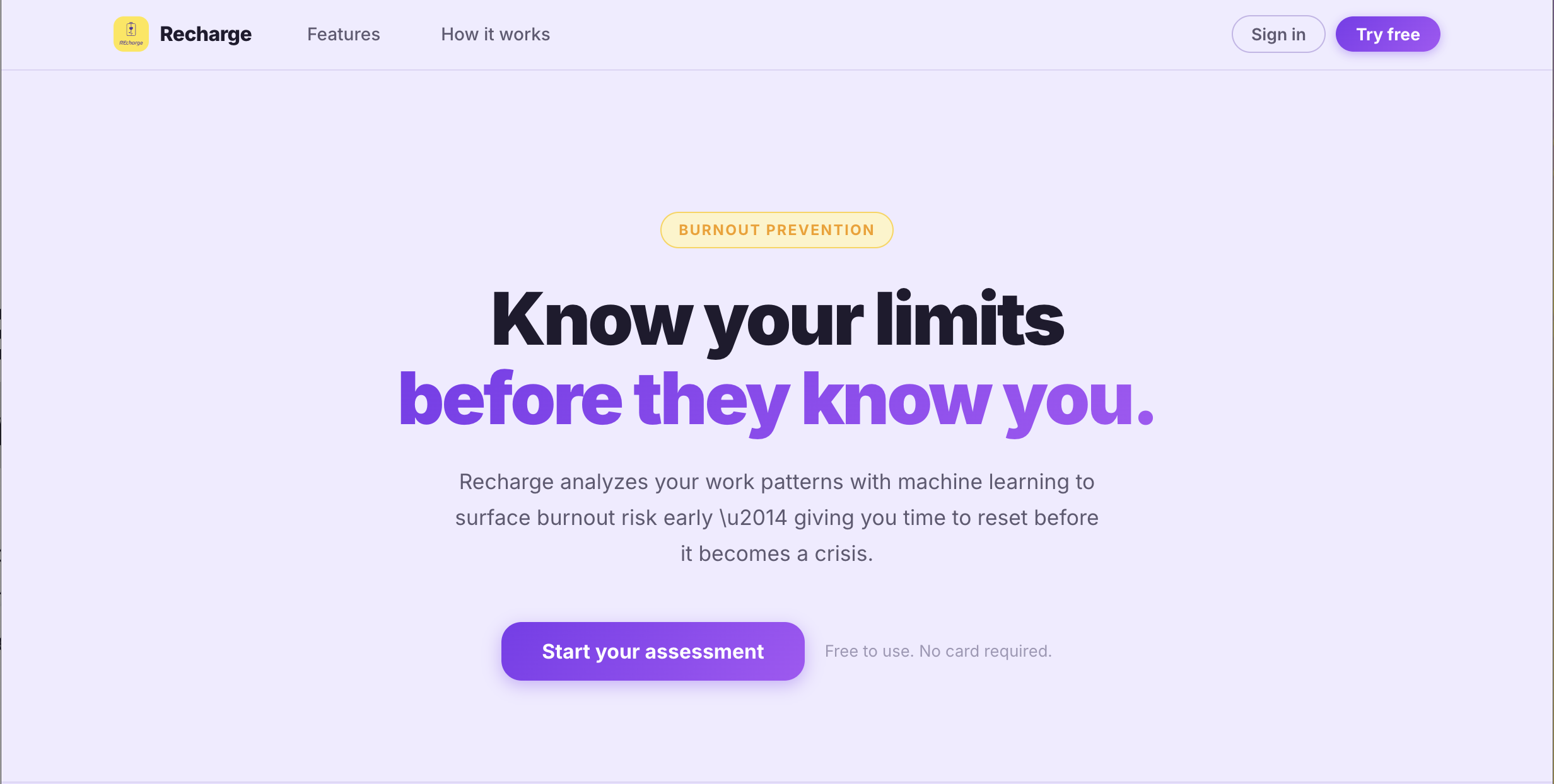 Burnout is invisible until it breaks you. We've all pushed through exhausted weeks telling ourselves "just one more sprint" — only to hit a wall. The problem is there's no early warning system. Existing wellness apps track moods reactively; they don't predict risk before it peaks. We wanted to build something that could tell you before you burn out, not after.
