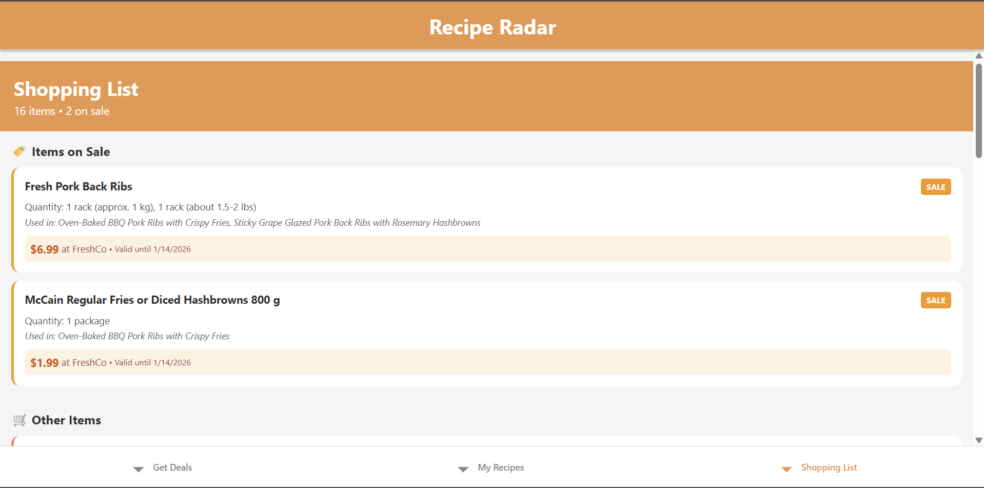 Recipe Radar generates AI-powered recipes based on current grocery flyer deals in your area. It automatically creates and updates shopping lists, highlighting sale items to help users save money and plan meals efficiently.