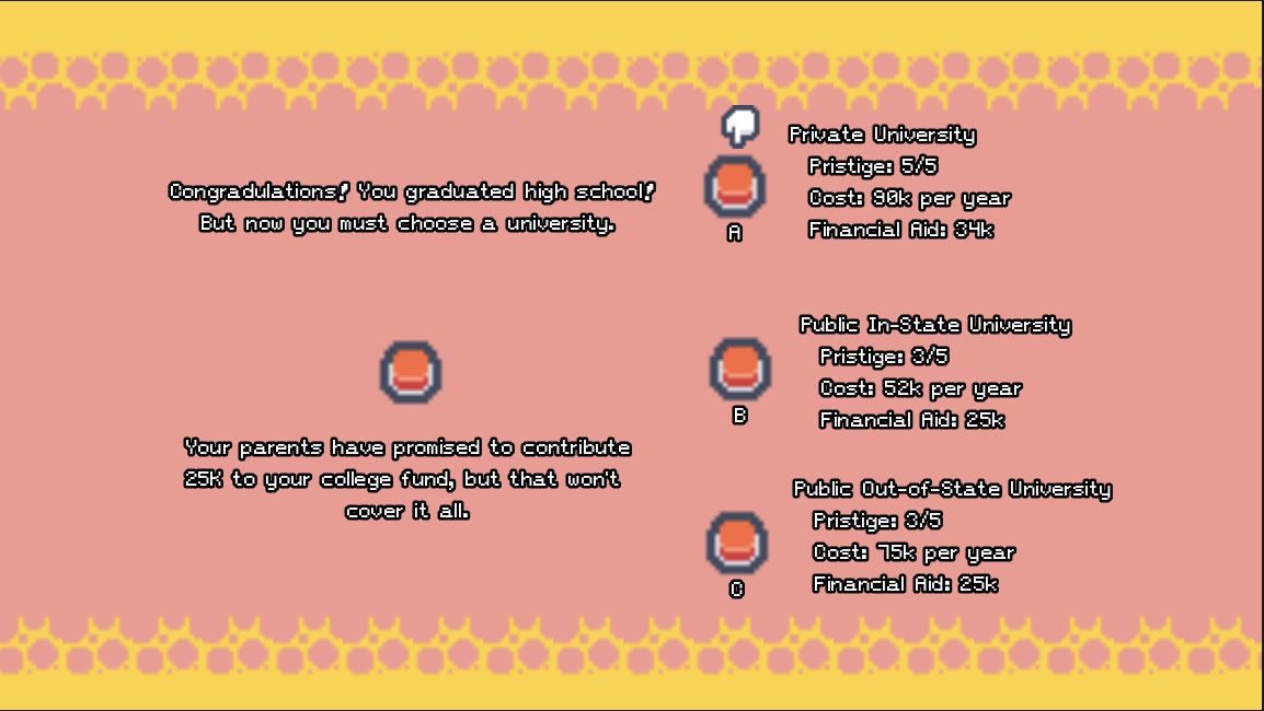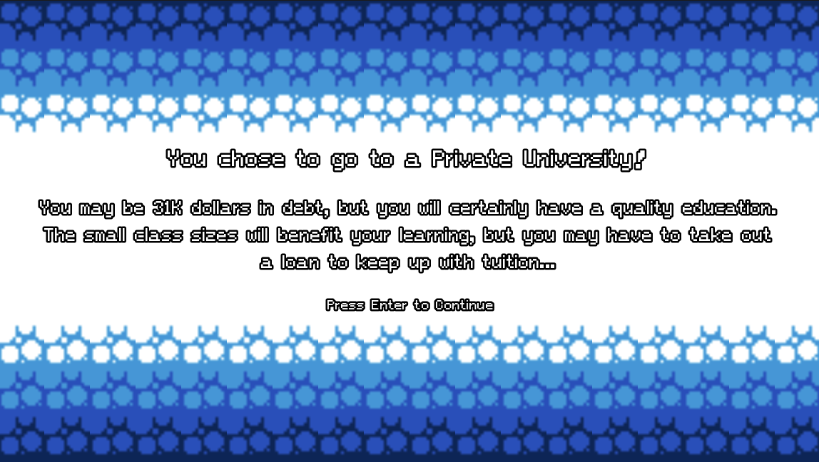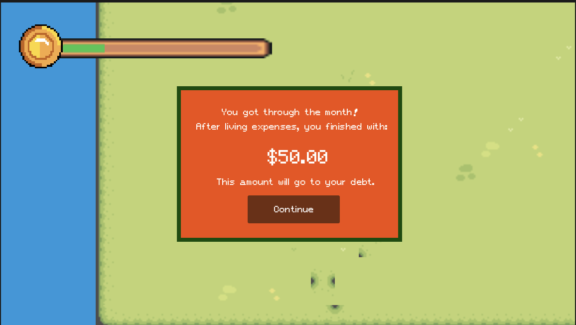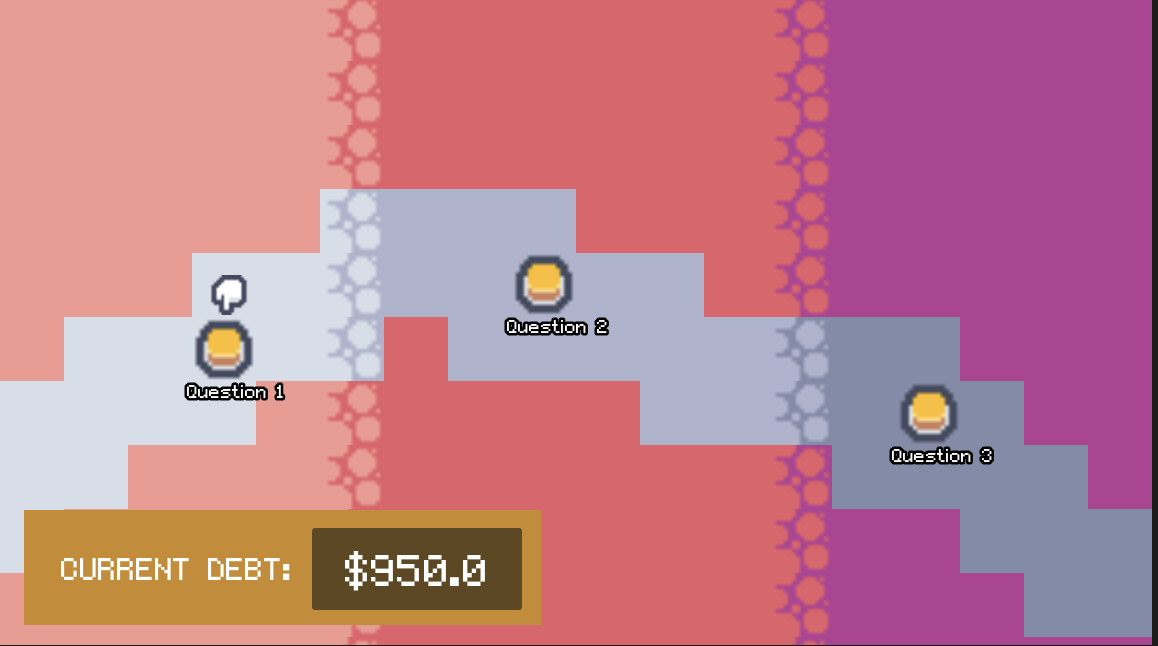 Our inspiration came from personal experience navigating student debt—feeling confused, unsure, and overwhelmed by financial decisions we weren't prepared to make. None of us had in-depth financial literacy backgrounds, but we had a strong desire to learn. As we researched the student debt crisis and its history, we realized we weren't alone: financial literacy education is often disengaging, formal, and confusing, leaving many students without the tools they need. We wanted to change that. Our goal was to create a fun, engaging experience that reaches students who can relate to our character's journey and learn to make responsible financial decisions in a low-stakes environment. The student debt experience is universal, and we wanted to empower our peers with the skills and knowledge to improve their financial outcomes. We also challenged ourselves by choosing a completely new game engine and scripting language—learning alongside our players.