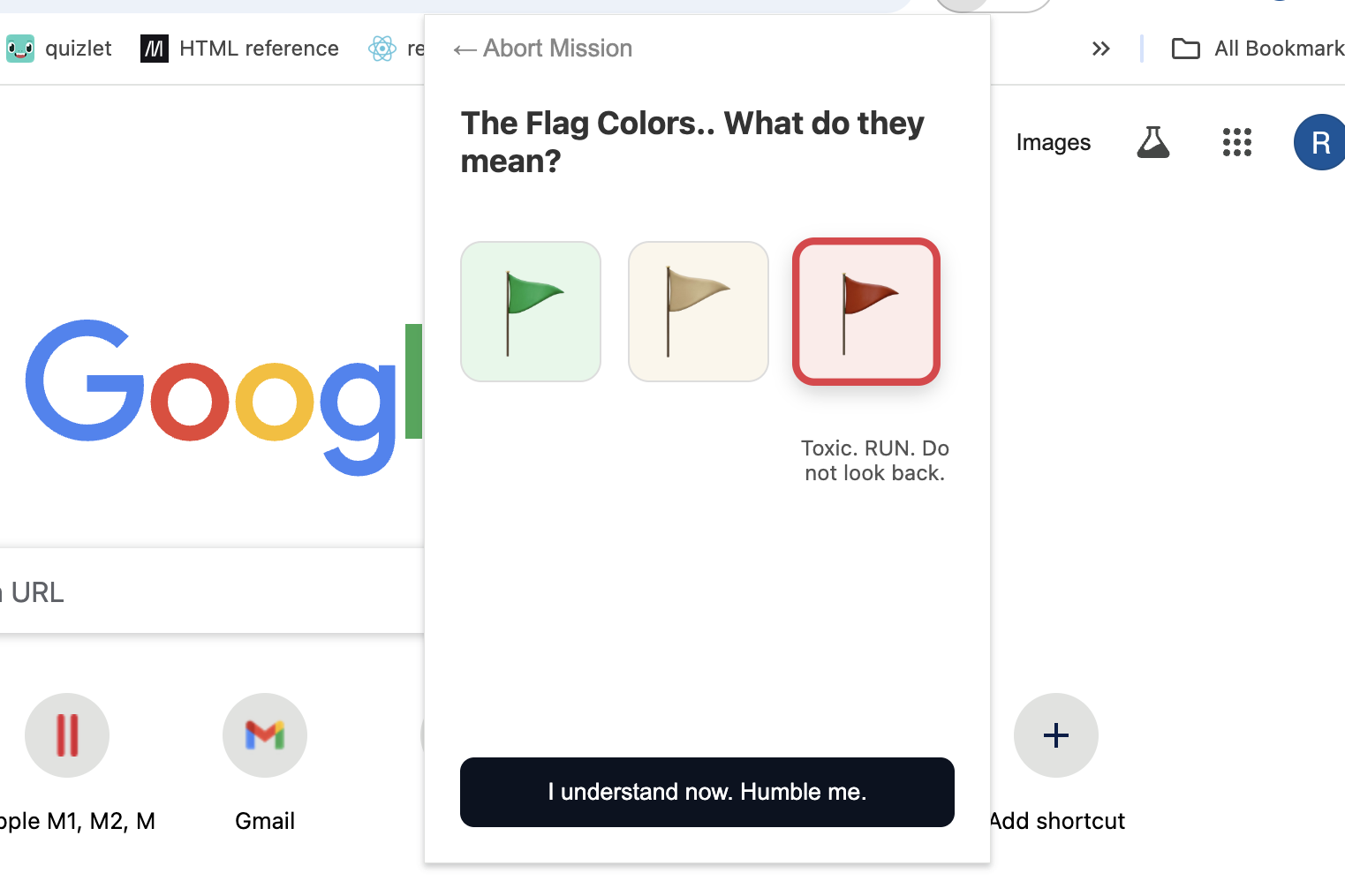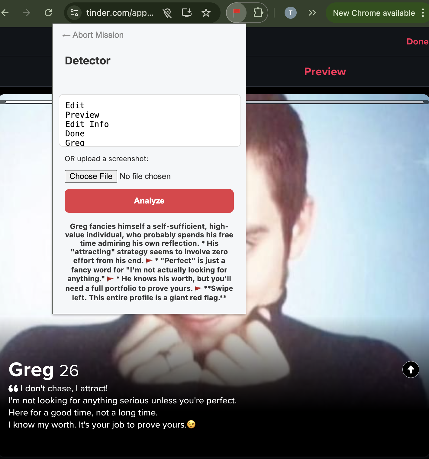 This Chrome Extension informs users on what exactly red, beige, and green flags are, before completely abusing the definition of a red flag. Users can choose to scan their current screen or input a text/file for the AI to brutally analyze and judge whether the user should swipe left or right, like a dating profile.