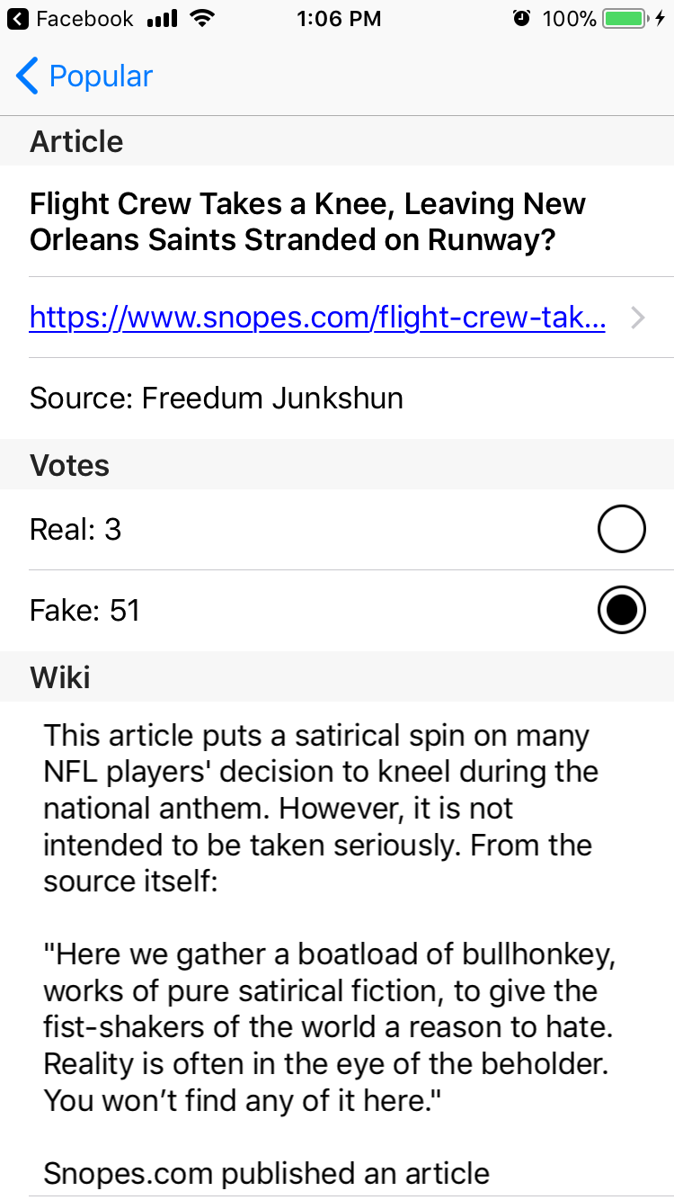 Redlines is an iOS app that allows users to search for news articles by url or title. An informative page for each article contains a wiki that's editable by anyone, and can contain any information that might be relevant to the credibility of the article. People can also vote on whether they believe that each article is fake. However, in order to edit or vote, people must log in with Facebook, which should reduce the amount of trolls and spammers.