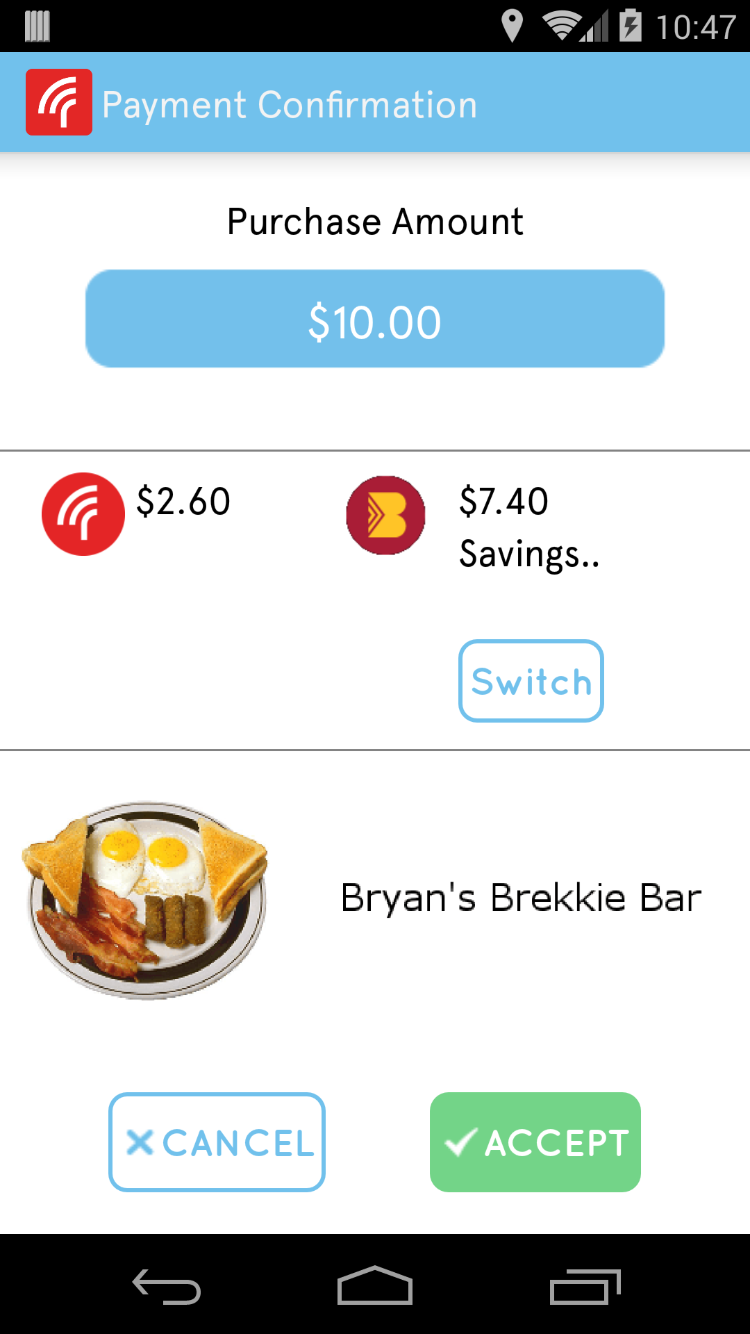 The shopper is able to view their redy dollars balance and change which linked payment method is used to complete the transaction. A receipt is stored in the Android host app once the transaction is completed successfully.