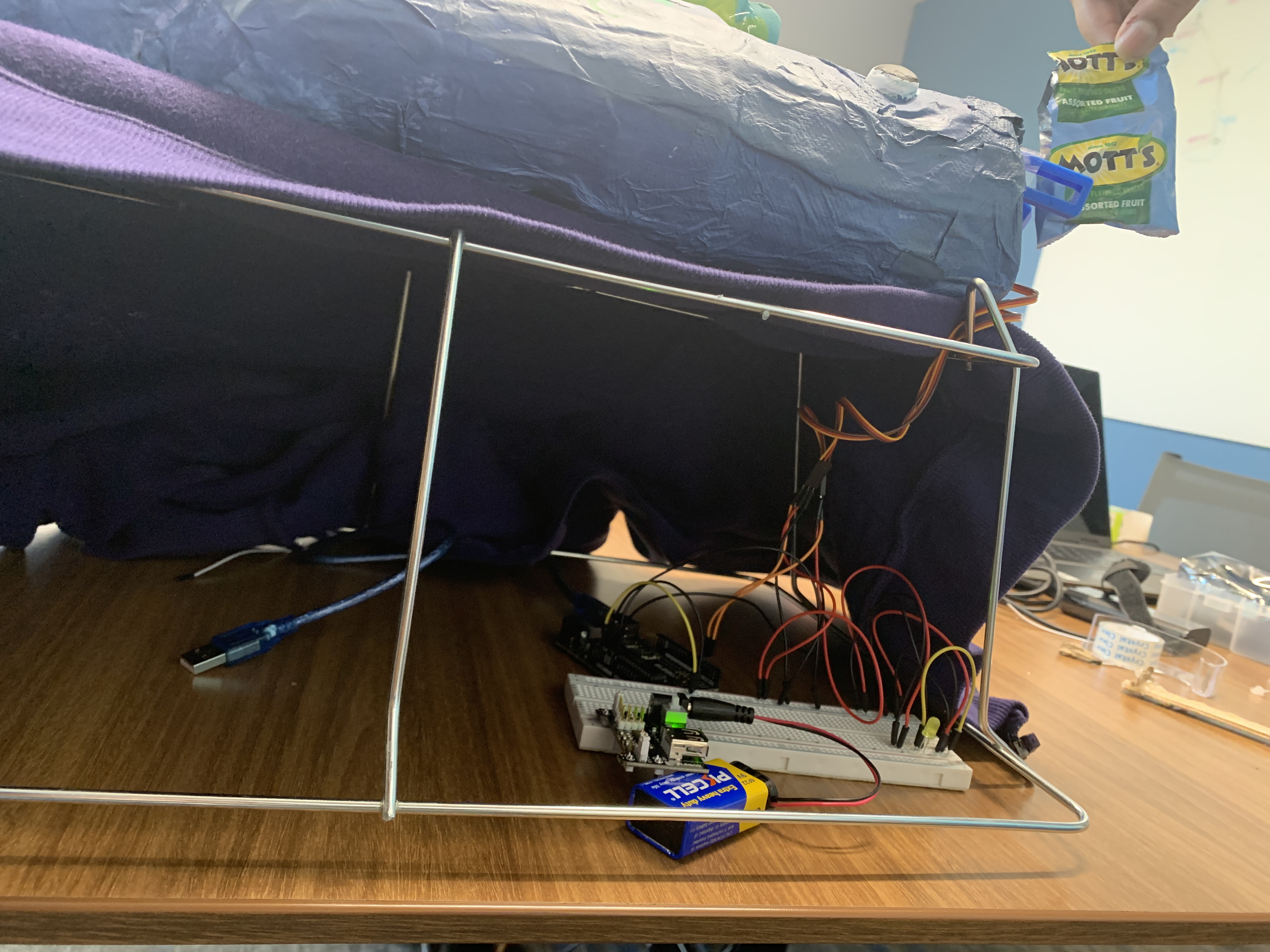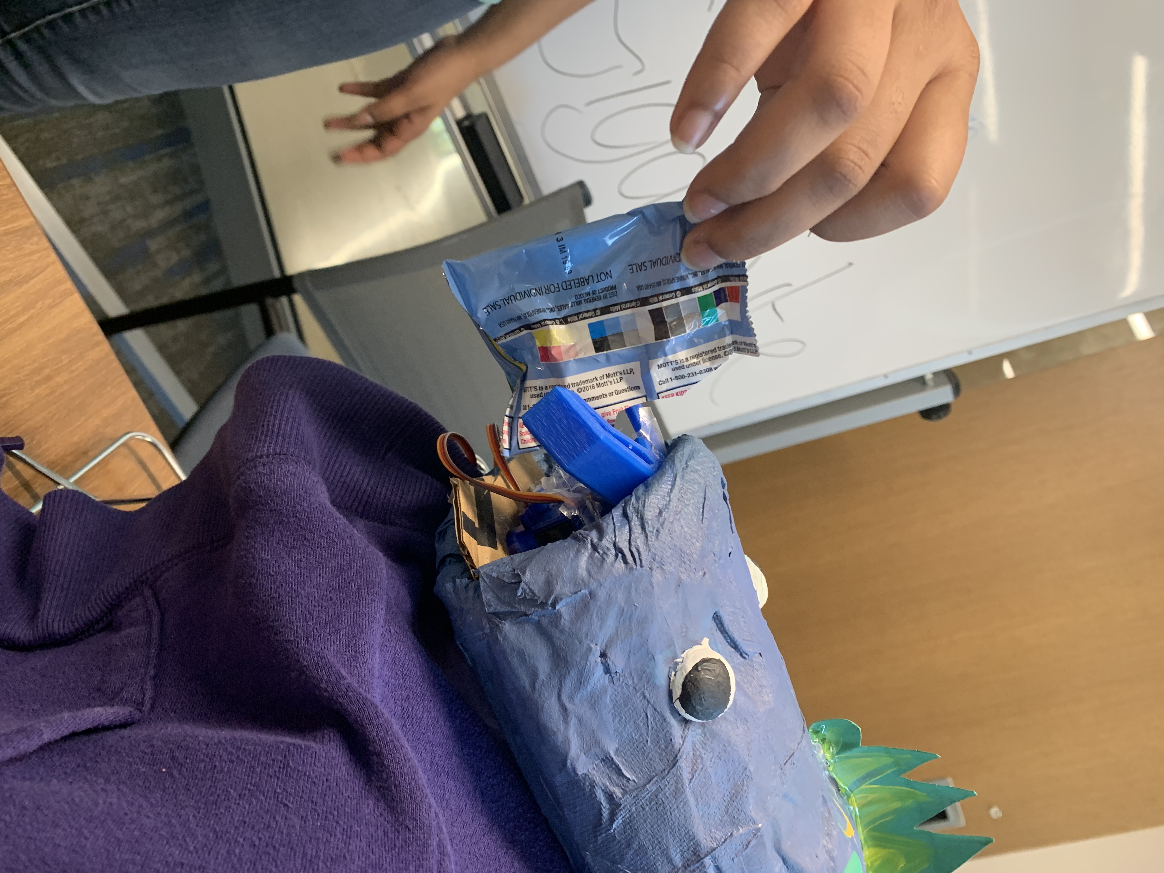 - None of us knew what Arduino even was before attending the workshop during the Makeathon. After attending though, we were enthusiastic about incorporating the technology in our prototype, but had a lot of difficulty getting the mechanism to start, keeping it from short-circuiting,