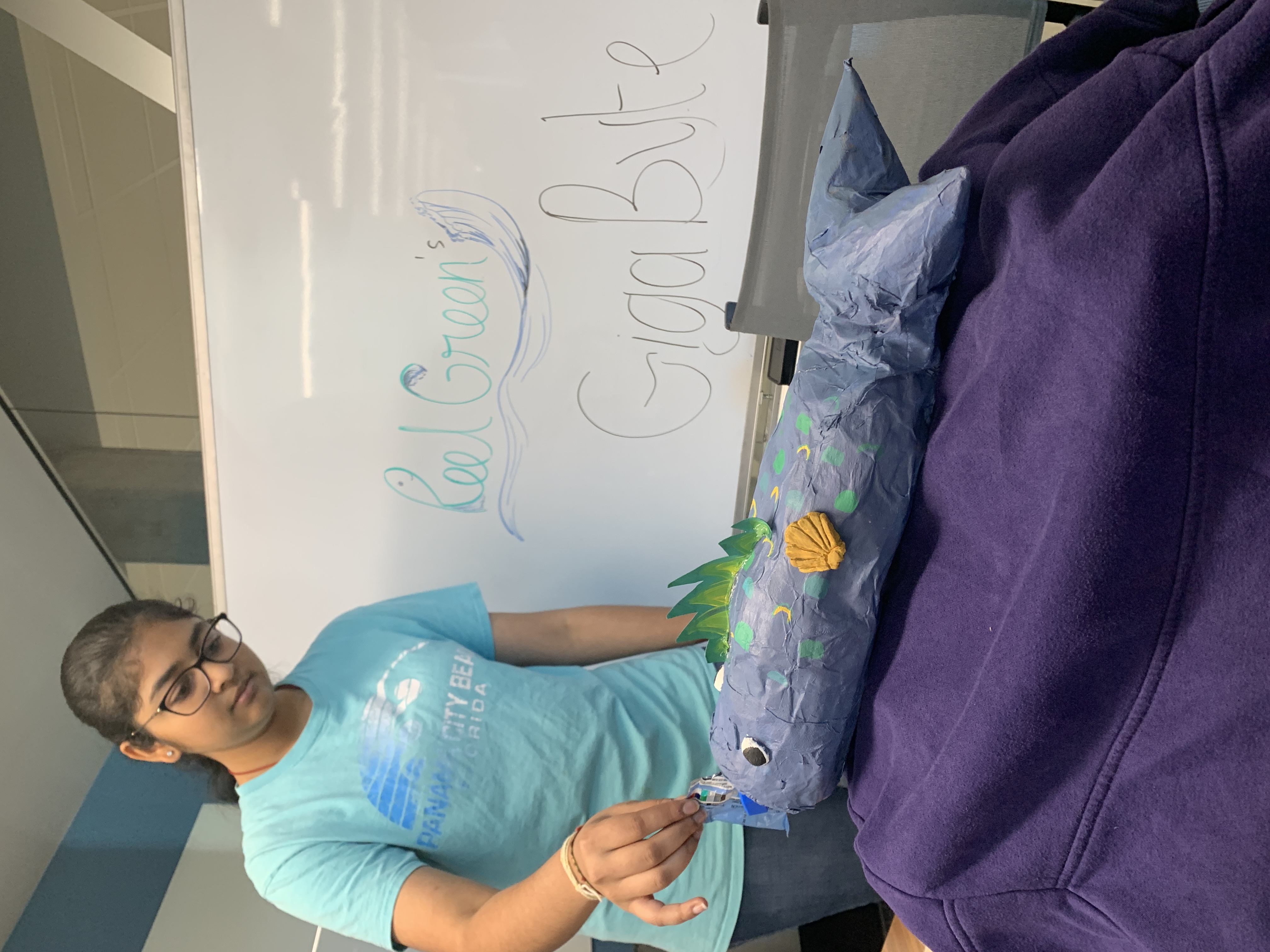 We built a hollow papier-mâché Smallmouth Bass fish that is able to collect garbage. In order to create our structure, we cut 1.5" strips of cardboard that we made into rings to represent the intersections of our fish. We connected these rings and reinforced the structure to provide a solid skeletal structure for our fish. On top of this, we layered recycled materials, such as used paper towels, coffee stirrer packaging, Dunkin Donut boxes cut into strips, and past homework assignments and worksheets, that were soaked into the papier-mâché solution of two parts water and one part Elmer’s Glue. All of these materials are sustainably reused, recyclable, and biodegradable (including the glue). Additionally, we were inspired by Bite’s swimsuit and mimicked the pattern, even adding the golden seashell.