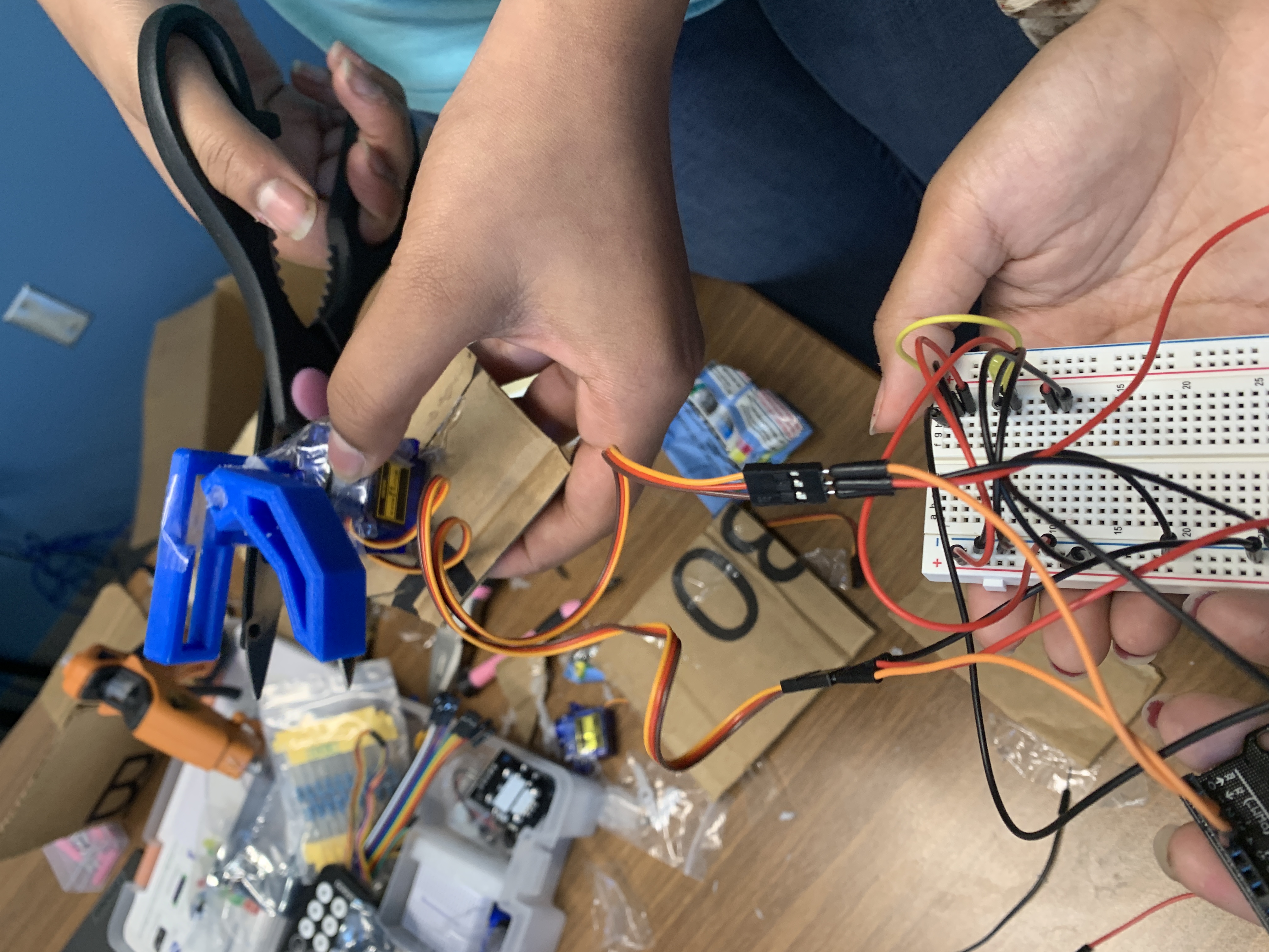 We made the claw mechanism using an Arduino kit, and we specifically used the Servo motors, the power supply, a breadboard, and pins. We made the claws by utilizing the 3D printer. Instead of using plastic, we printed our claw using PLA filament, which is corn-based and biodegradable. We also used recycled cardboard to support the structure of the claw mechanism.