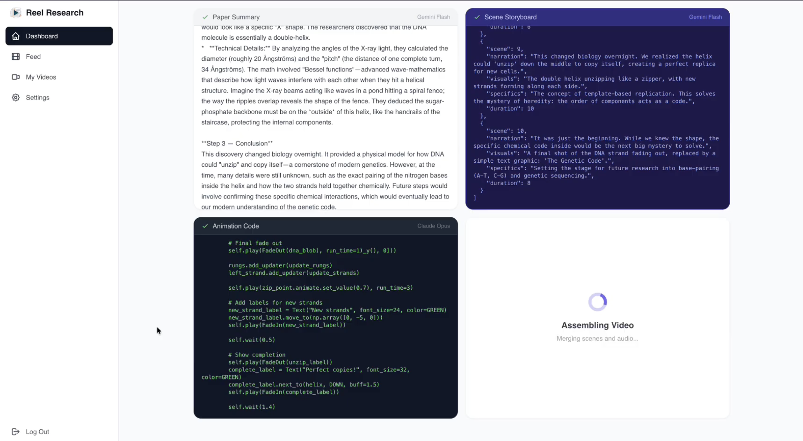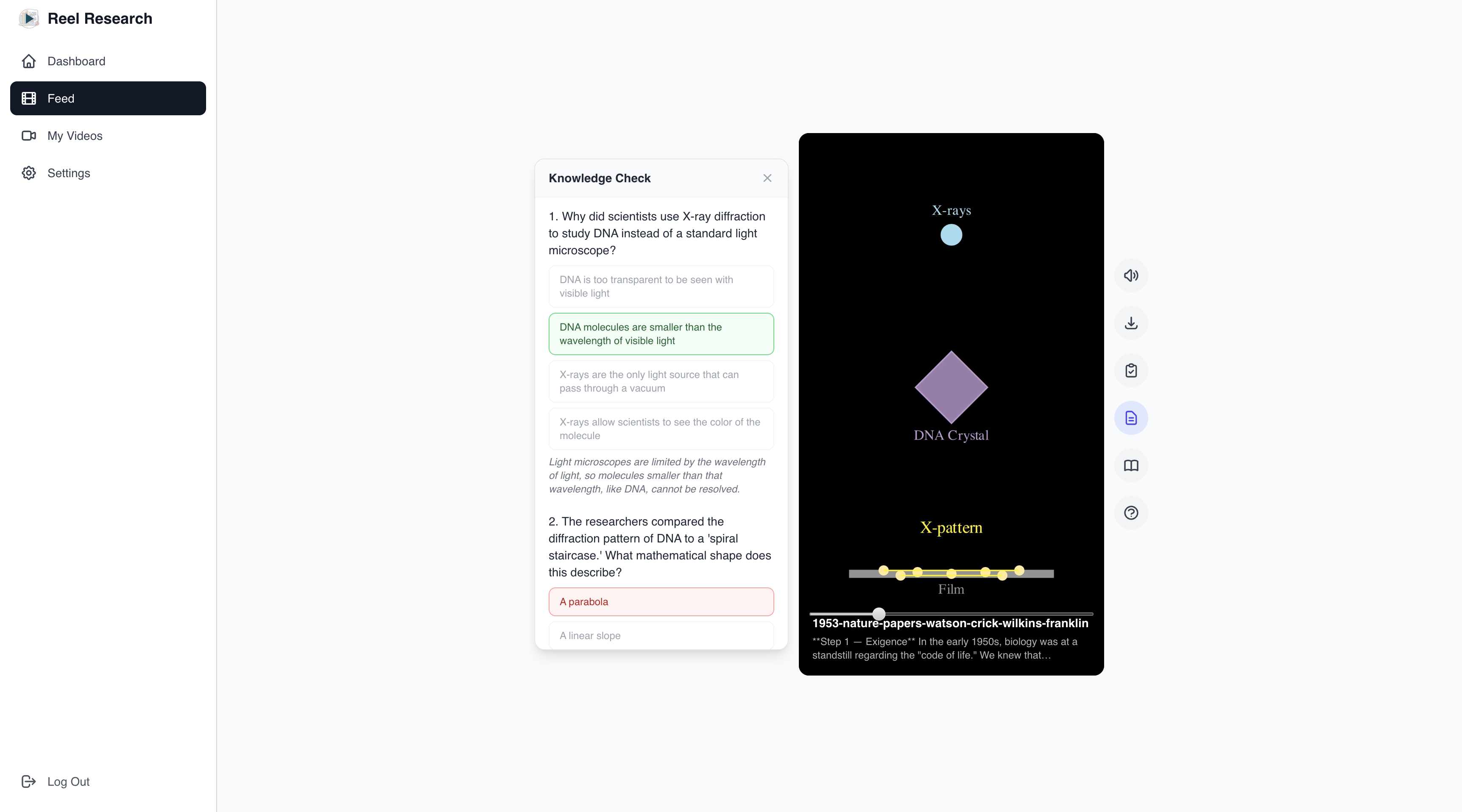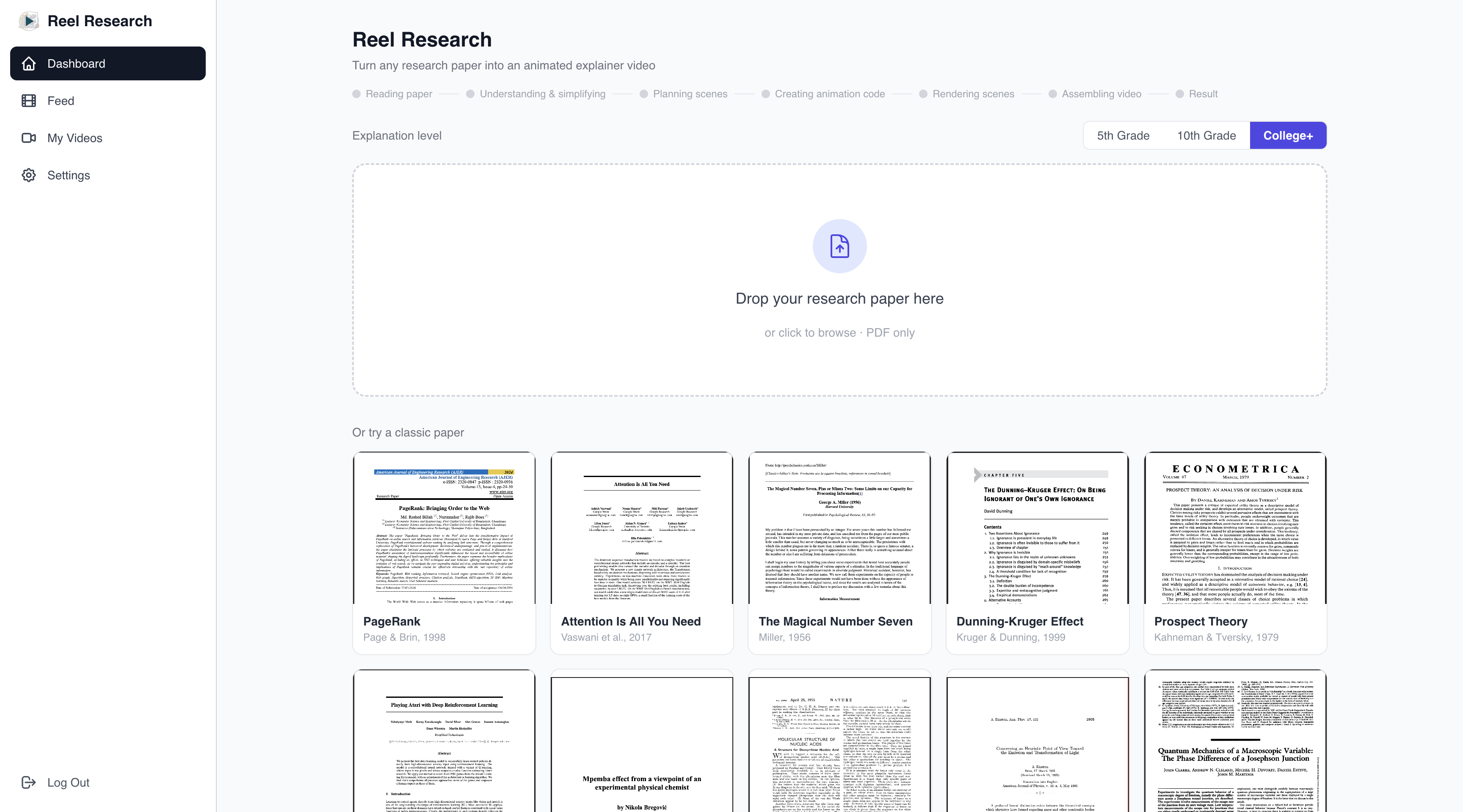 ReelResearch allows a user to upload a research paper, select which grade level the explanatory video should be (5th grade, 10th grade, College+), and generate a 1-2 minute video using a narrator and visual animations (graphs, diagrams, data visualizations, and motion graphics) designed to provide simple intuition to complicated topics. In addition to generating video and audio, ReelResearch can give users a quiz about the video, a knowledge summary of the video, a list of similar papers to read, and a chatbot that answers more questions.