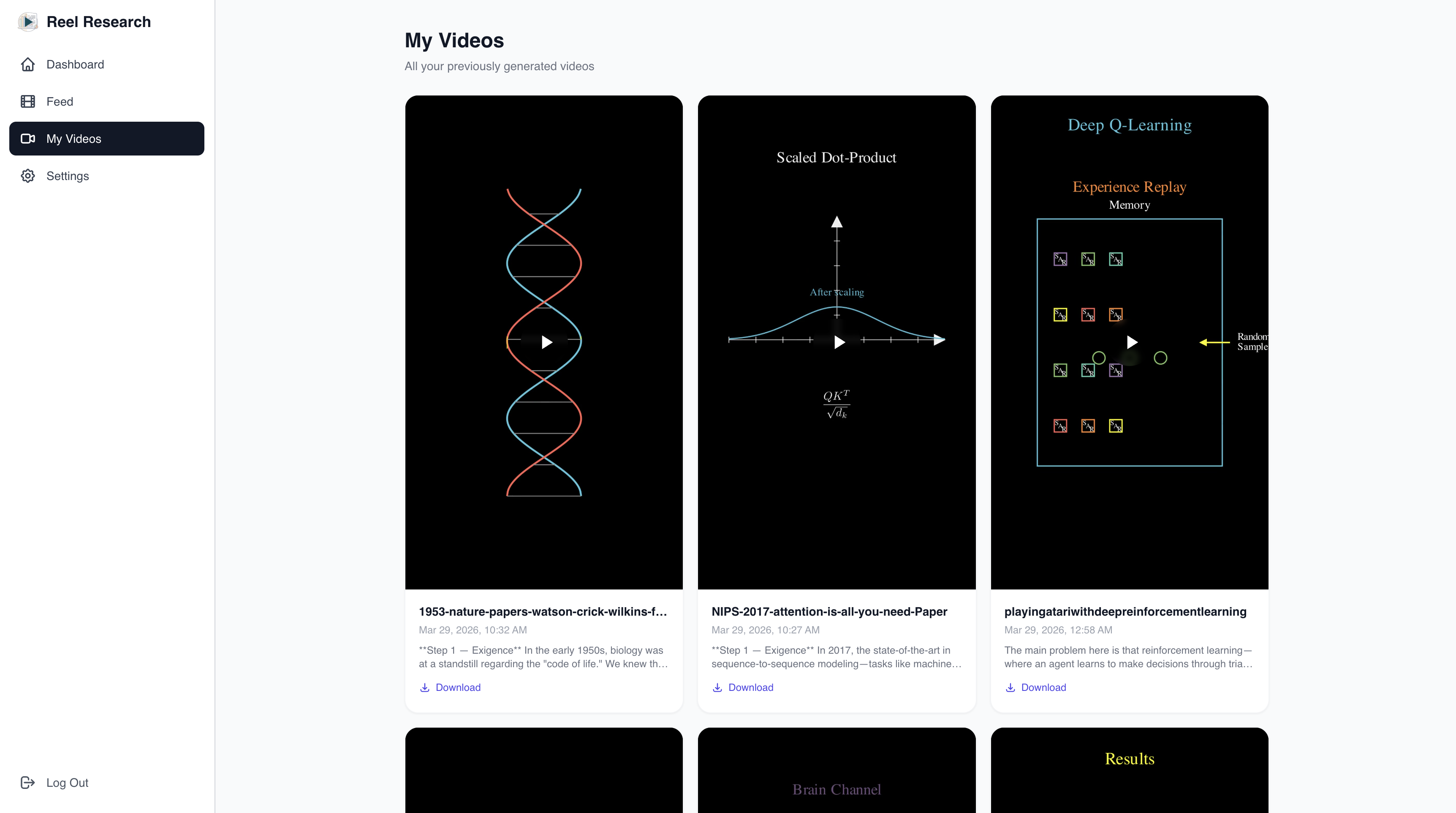 As college students who have published research and have a strong interest in academics, we love reading and learning from research papers. However, scientific jargon and dense text make incredibly interesting papers inaccessible to non-experts. In our eyes, the most important aspect of these papers is to walk away with an intuitive, comprehensive understanding of the key ideas discussed and greater curiosity to learn more, not feel unmotivated and unprepared to explore cutting-edge fields. Taking inspiration from the famous 3Blue1Brown channel, we created ReelResearch to synthesize and intuitively visualize research papers in interactive animations tailored to user skill level so you can gain further insight whether you are a graduate student trying to refine your understanding or a high schooler curious about the field.