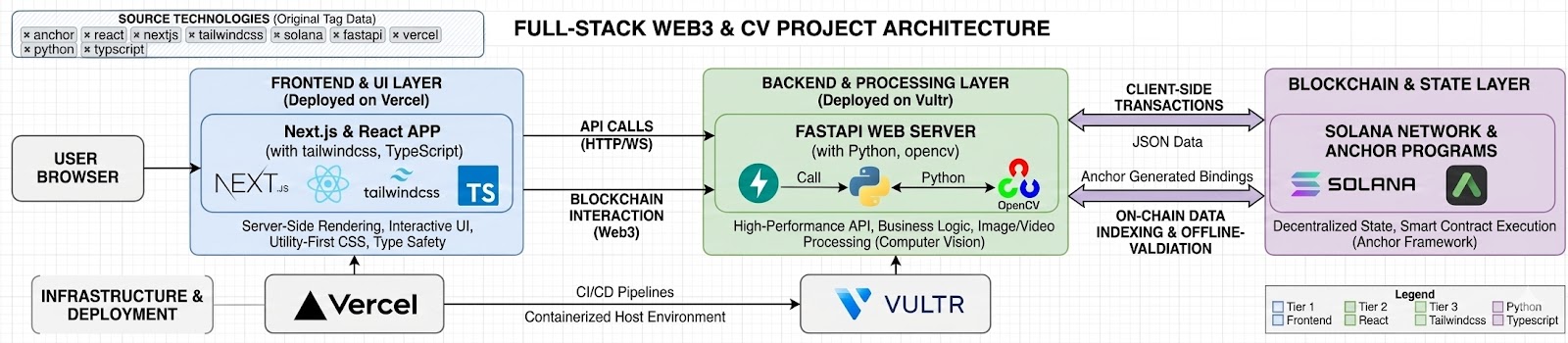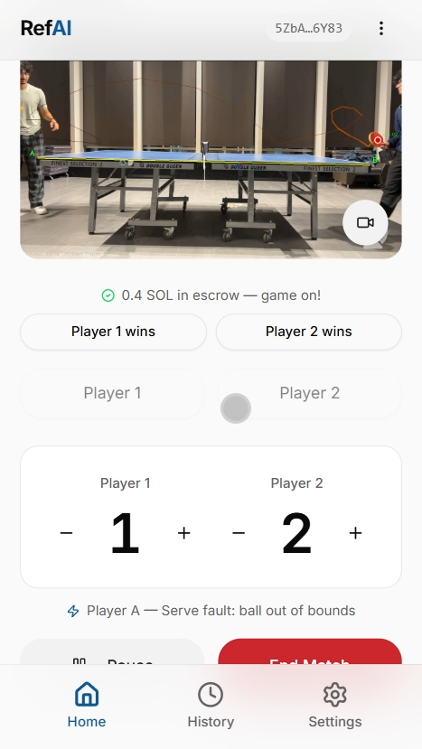 Ref AI pairs a unique computer vision model using colour masking to track the ball, along with a game-logic system that covers all possibilities of table tennis. We ensure that every point is properly counted and justified, giving players and wagerers peace of mind. To further build on our theme of fairness and security, we utilize Solana, along with our own script, which was implemented with the help of Google Antigravity. This employs a middleman to ensure all wagers are secure and have a guaranteed payout. By deploying our backend, consisting of the computer vision model and the game logic using Vultr and our frontend using Vercel, we create an atmosphere where everyone feels like they are in the game by providing a live feed. Controlling interactions between these two deployments ensures our application runs seamlessly and efficiently by utilizing two hosting platforms.