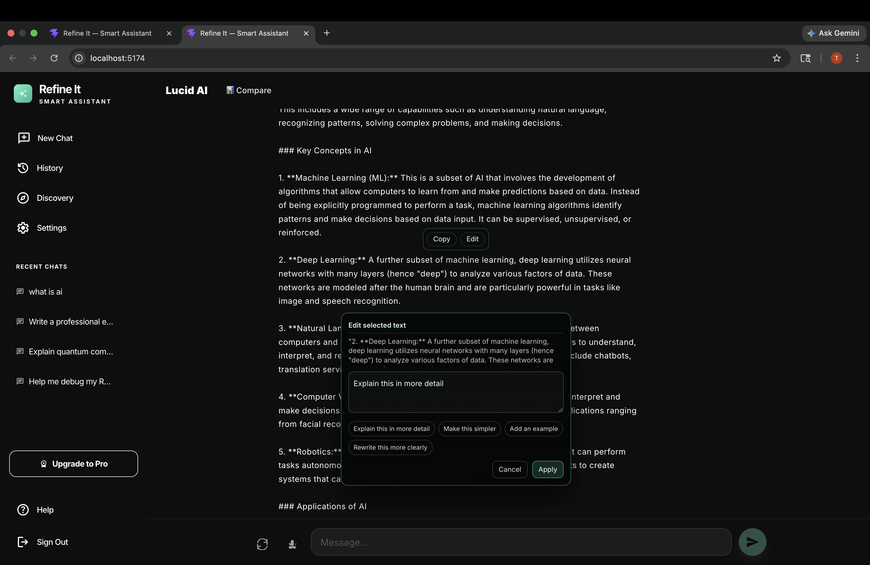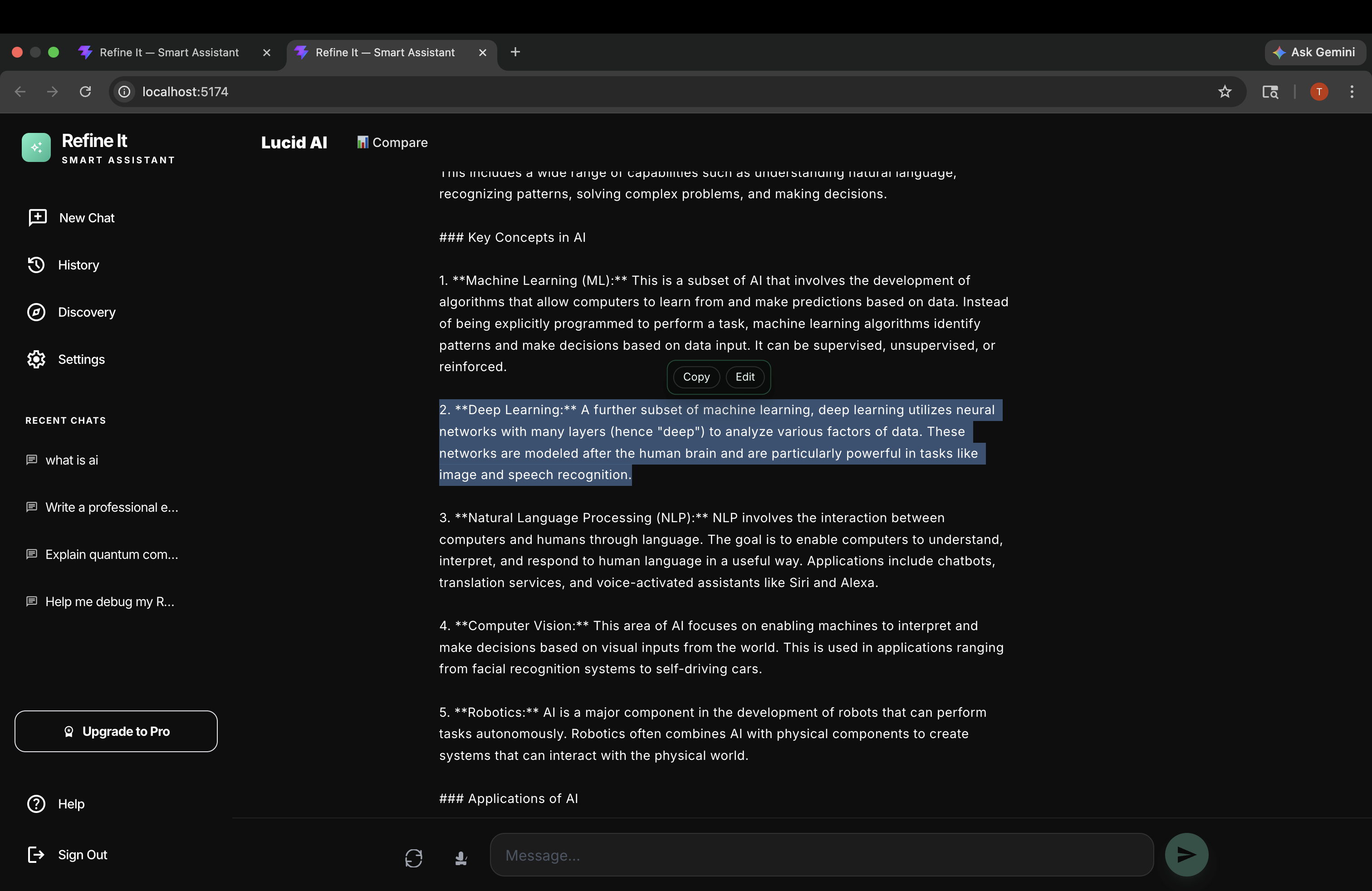 Refine-It is a chat interface that lets you select any part of an AI response and refine just that block — without regenerating the entire answer. Highlight a sentence, click refine, give feedback, and only that part updates. Everything else stays exactly as it was.
