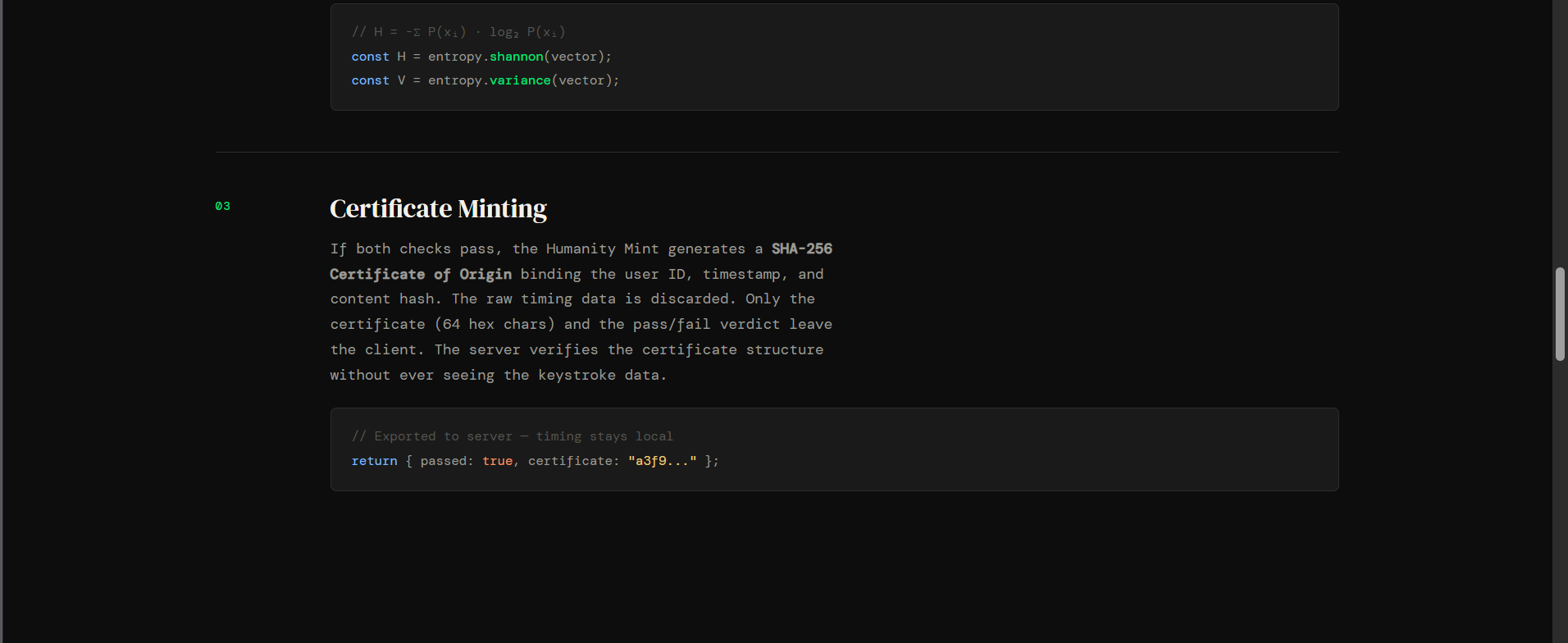 Getting zero-knowledge telemetry working entirely client-side was a big win as platforms get a verifiable certificate without ever seeing a user's raw keystroke data. The two-tier detection pipeline (human check + AI grader fallback) also means the system is nuanced rather than binary.