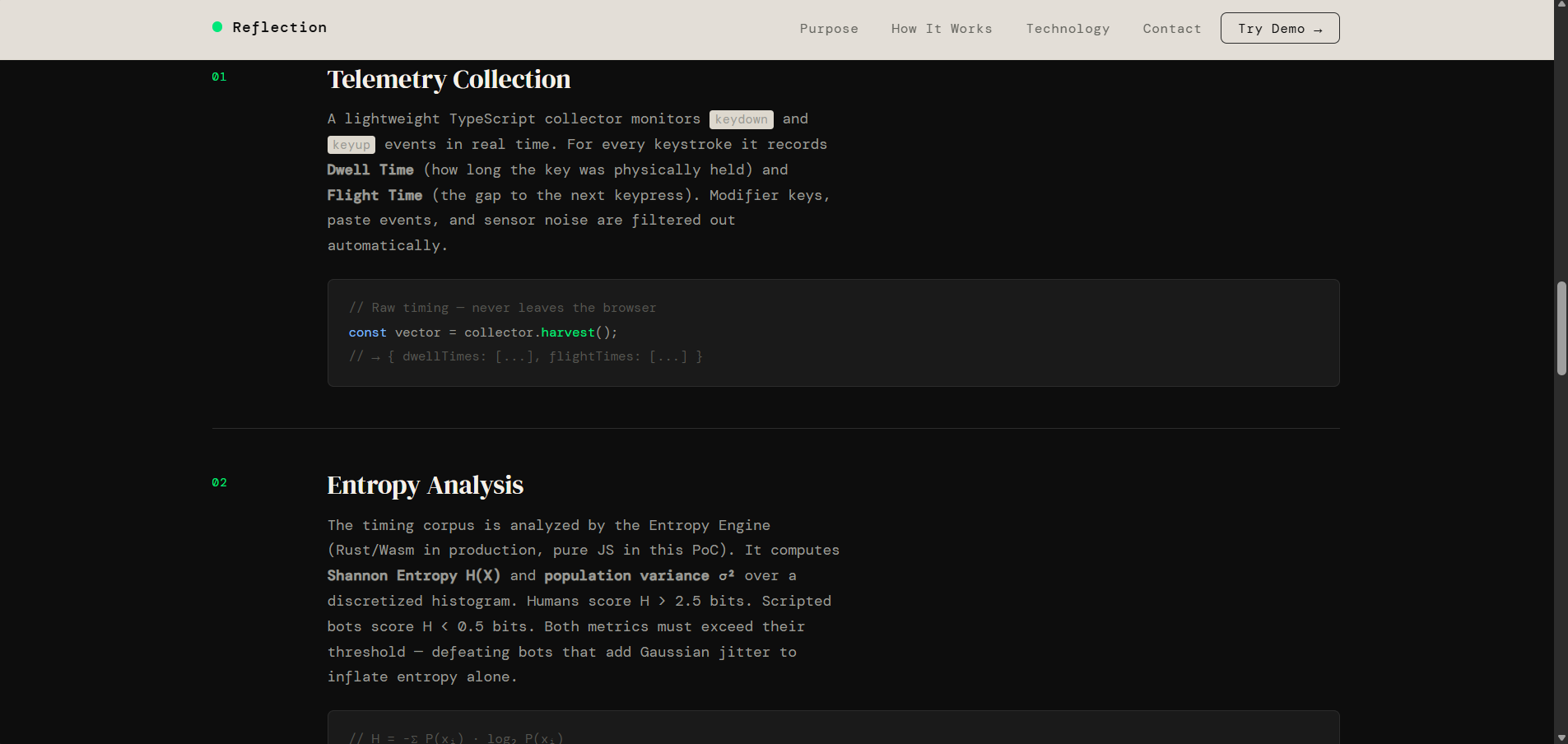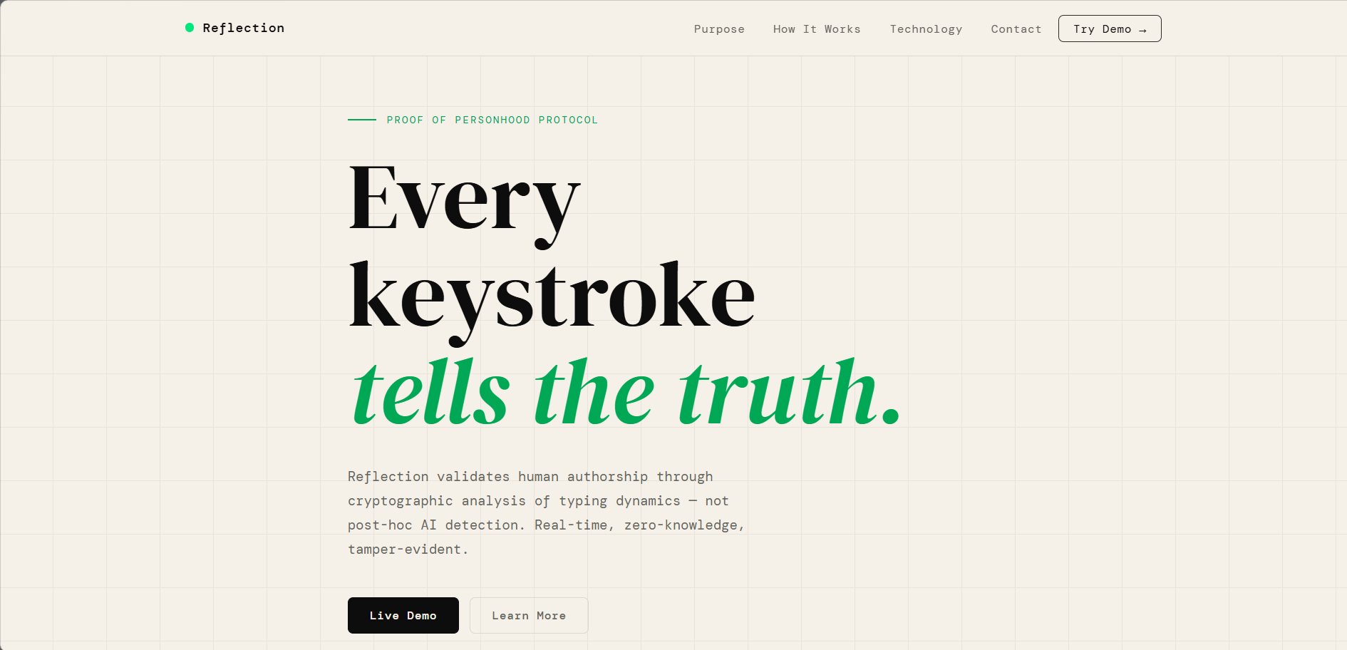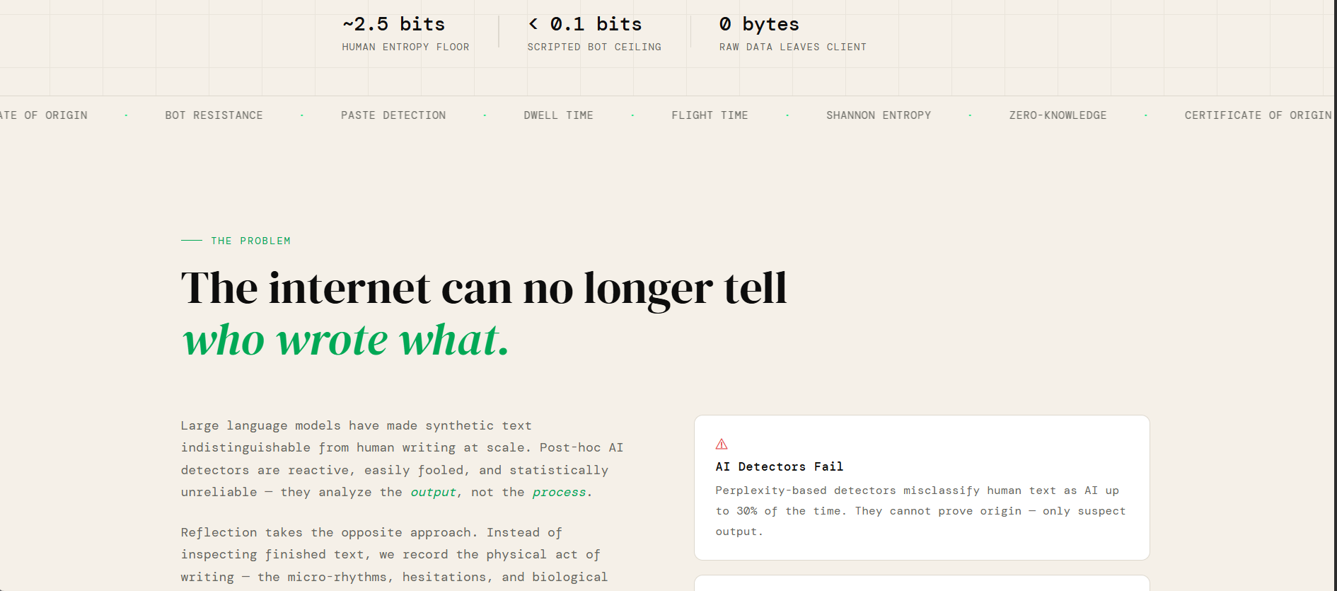 Reflection gives platforms a way to verify human authorship and grade content quality before it's posted. It captures keystroke dynamics as you type, dwell times, flight times, rhythm patterns, and runs them through an entropy analysis engine to issue a cryptographic Certificate of Origin. If the human check fails, an AI grader scores the content on a 0-10 scale so platforms can still allow high-value AI content while blocking spam and filler.