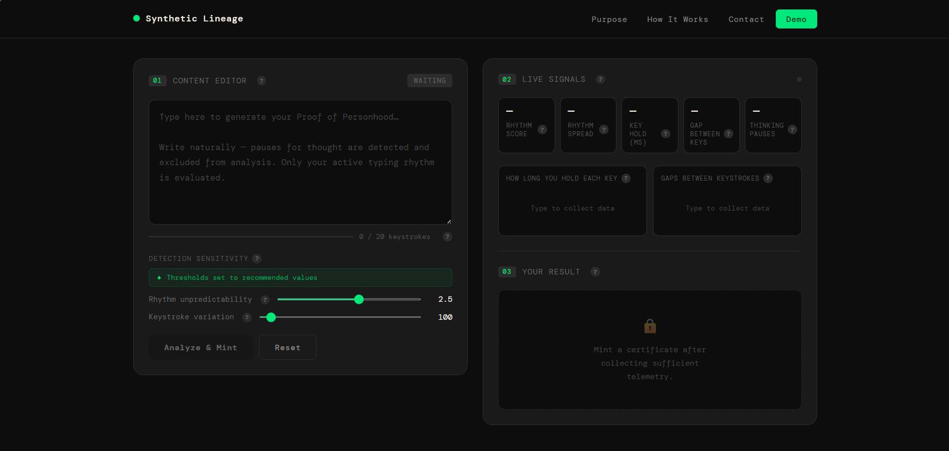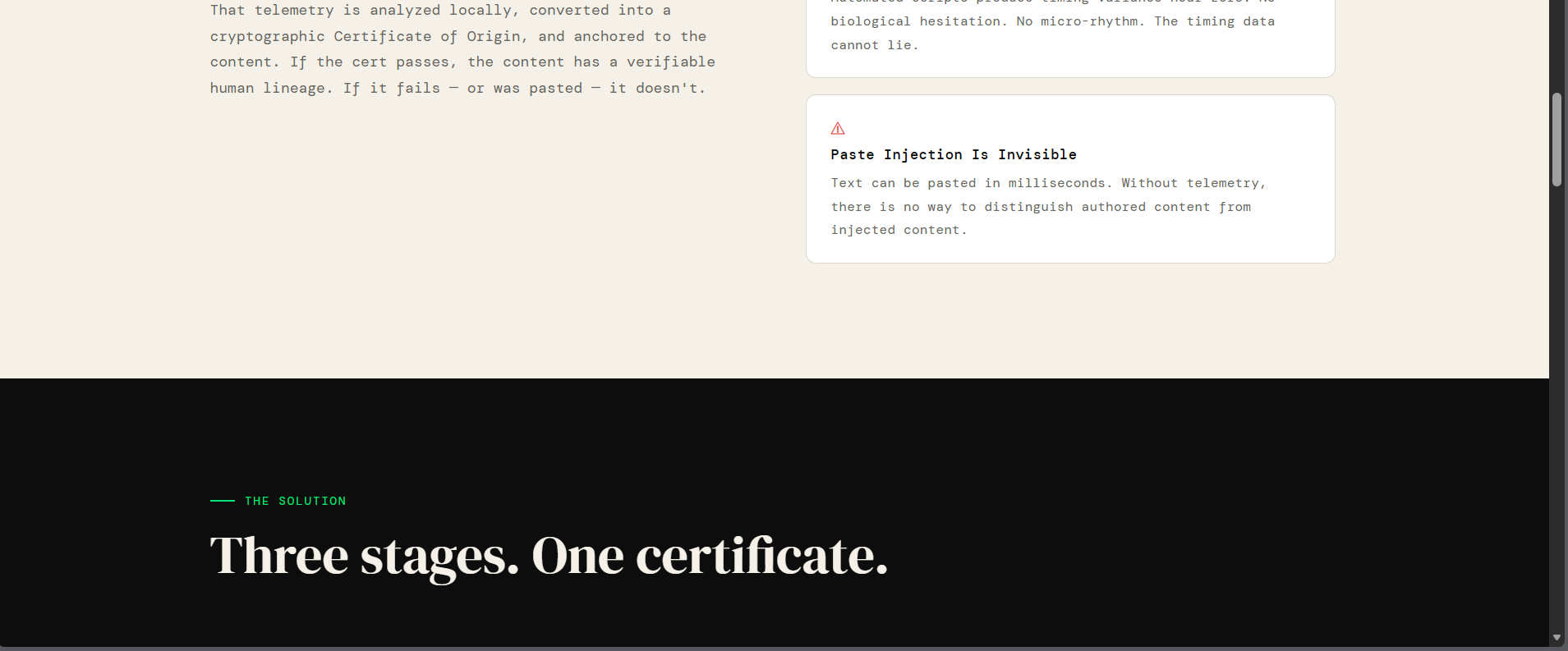 Social media and online platforms are overrun with automated, AI-generated content that's becoming impossible to distinguish from human writing. Existing AI detectors are reactive, unreliable, and easily fooled, they analyze the output, not the process. We wanted to build something that proves human authorship at the moment of creation, not after the fact.