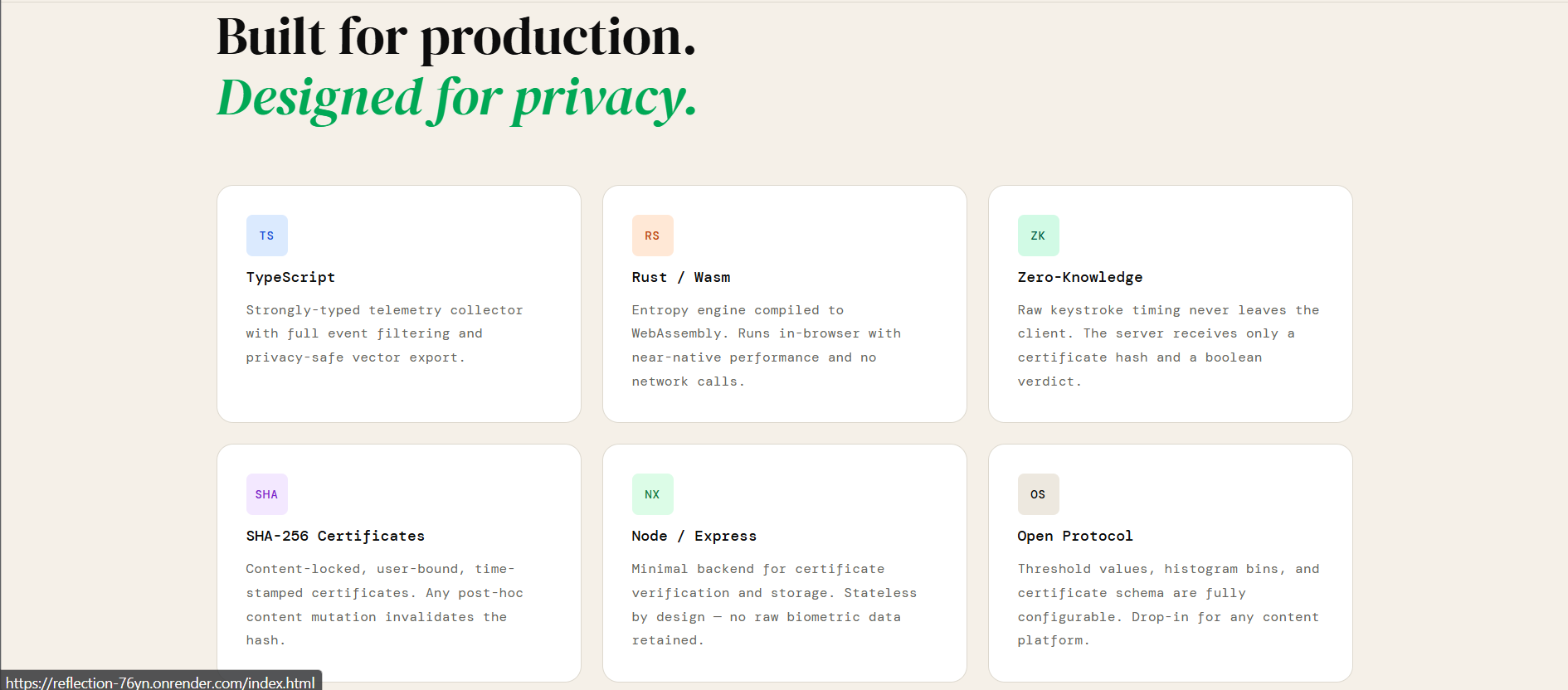 We built Reflection with a vanilla JS telemetry collector that captures keystroke timing entirely in-browser with no raw data ever leaving the client. The entropy engine computes Shannon entropy and variance over the timing distribution to detect human rhythm. The backend is a lightweight Node/Express server that proxies content grading through the Groq API and stores certificates.