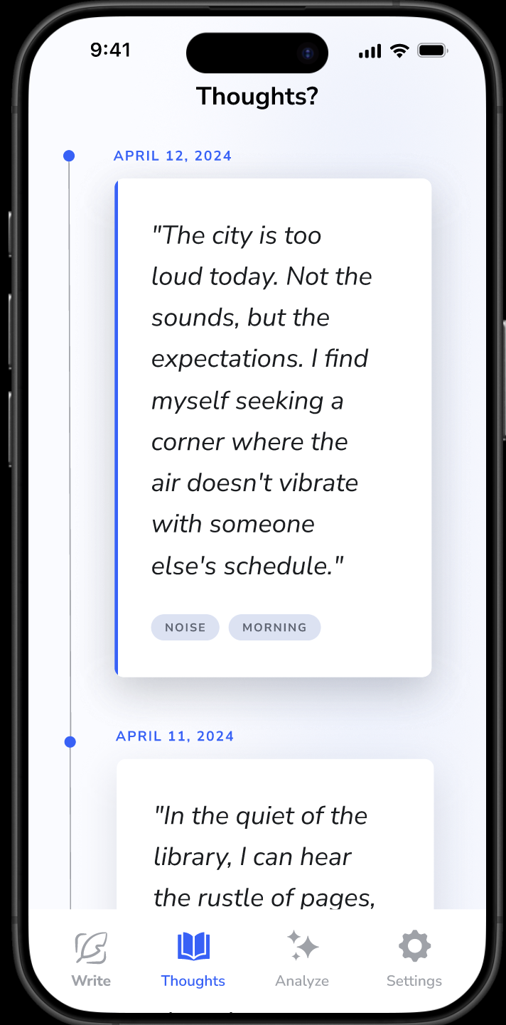 Let us break it down. We designed the entire experience in Figma prioritizing typographic hierarchy over heavy visual elements. We relied strictly on the Inter font family and a minimalist white and electric blue palette. The interface uses text opacity rules to establish order and gets out of the way so the user can focus entirely on the thought. We completely removed artificial intelligence from the loop to ensure the user maintains total agency over their memory.