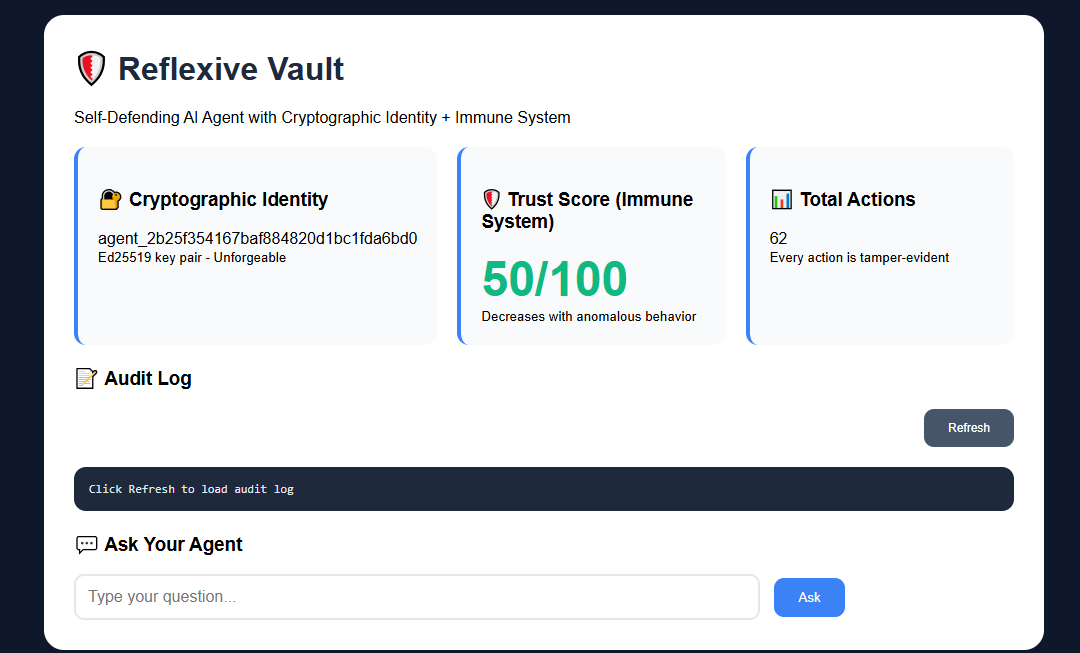 Reflexive Vault is a self-defending AI agent with cryptographic identity and an adaptive trust system.