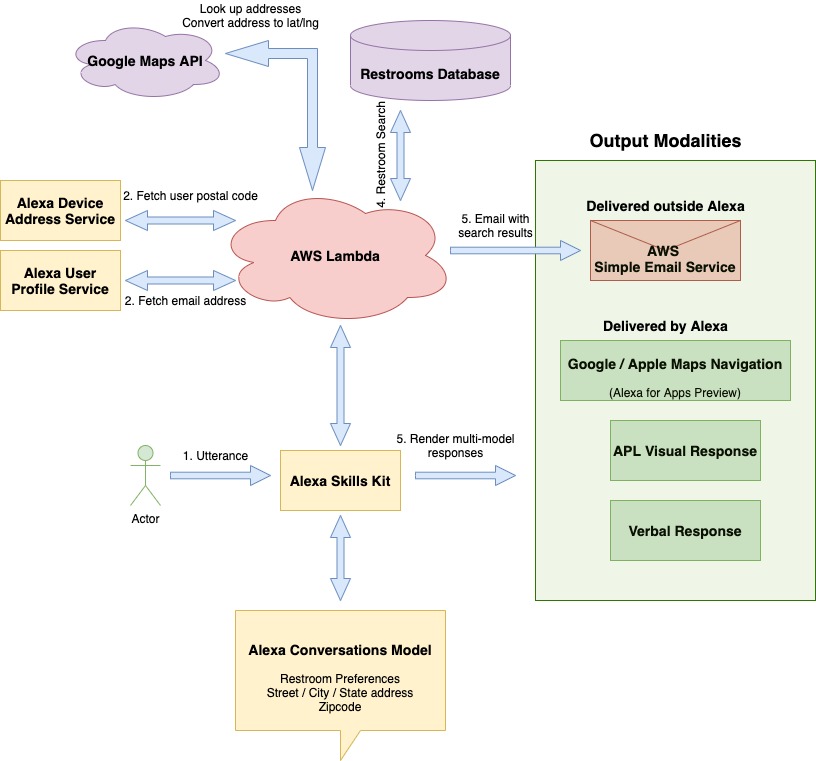 AWS Simple Email Service As I built the skill, I realized that just searching for restrooms and giving a voice response isn't really sufficient. It is very useful that they have a clickable navigation link (like Google Maps).