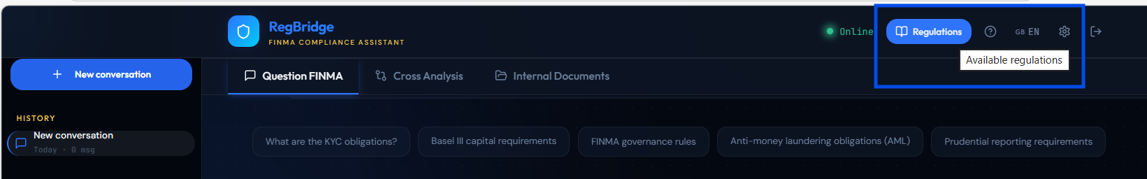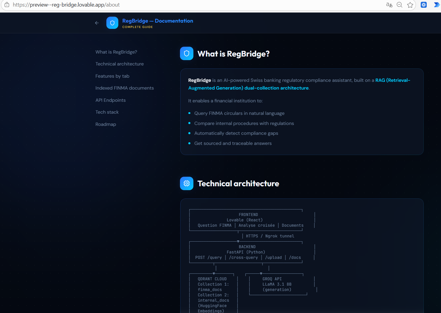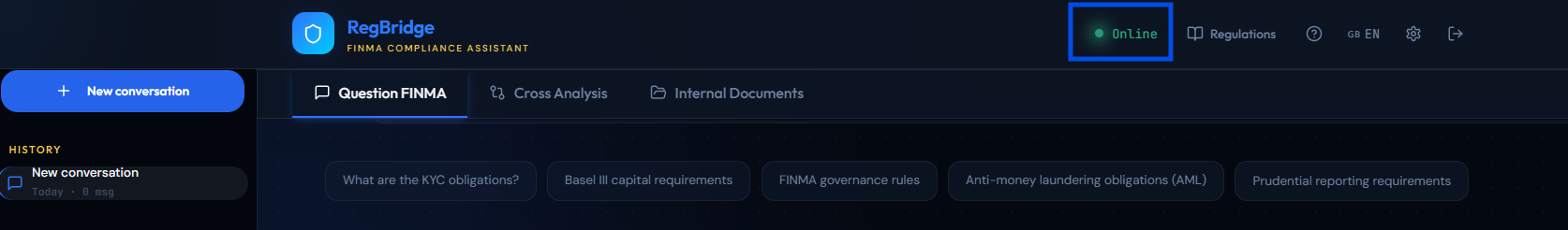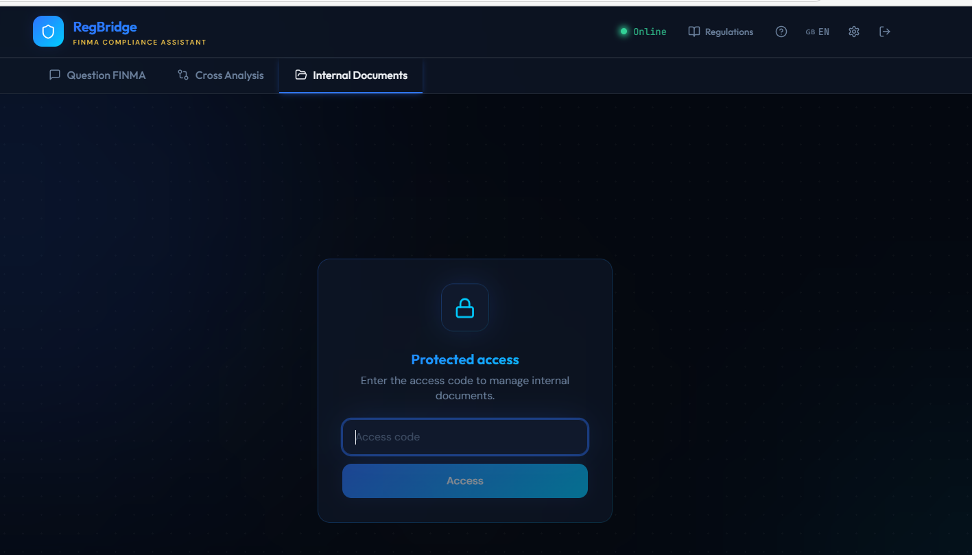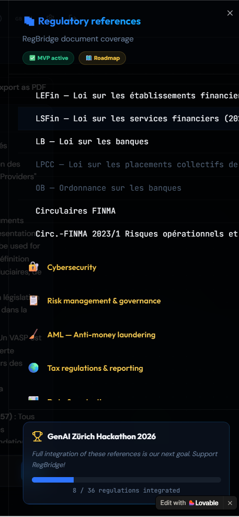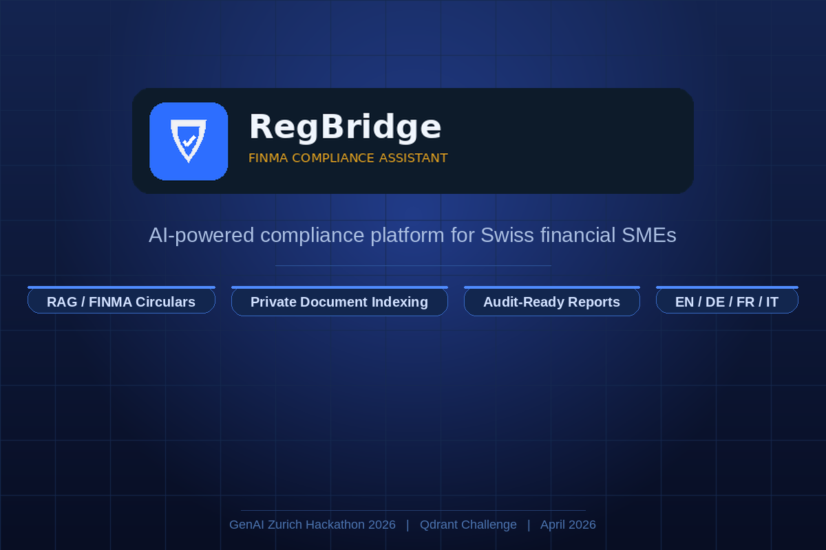 RegBridge is a RAG-powered compliance assistant for Swiss financial SMEs — independent wealth managers, cantonal banks, fintechs, and family offices regulated by FINMA.