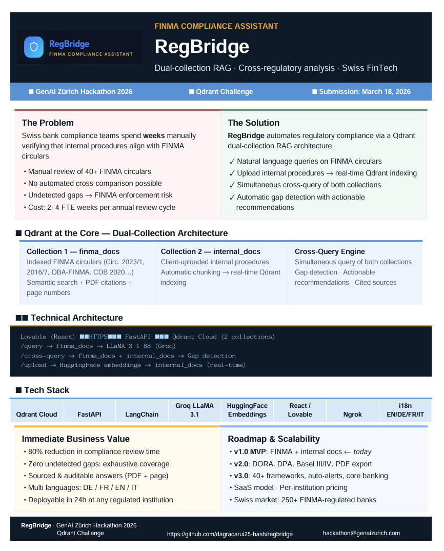 With 24 years of experience in private banking in Geneva (SG, UBP), I witnessed firsthand how compliance officers spend hours manually searching hundreds of pages of FINMA circulars to answer a single regulatory question. One wrong interpretation can cost a bank millions in fines. I wanted to fix that — and the Qdrant challenge was the perfect opportunity to build it.