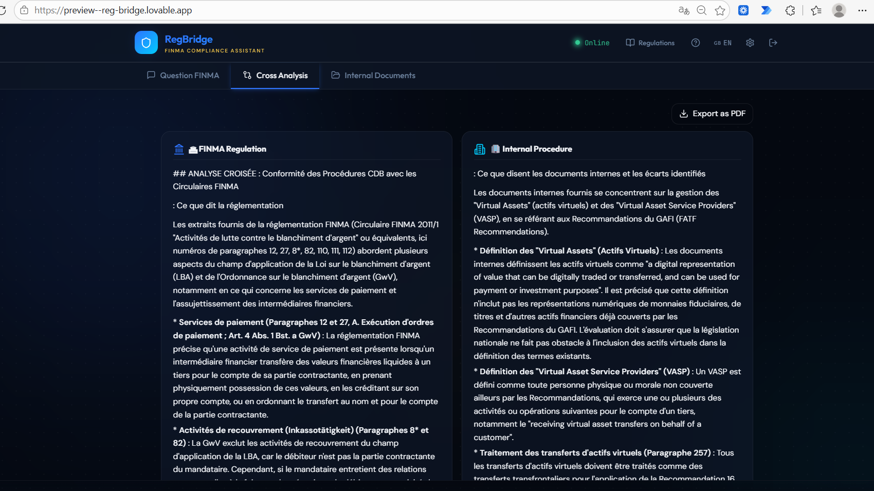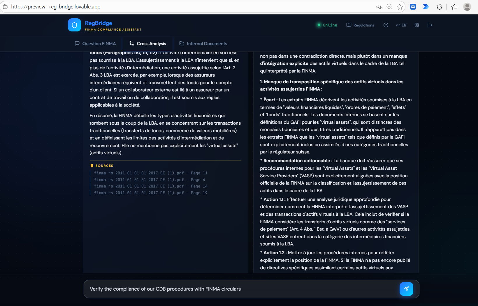 - Activate cross-search mode to automatically detect gaps between your internal procedures and FINMA requirements