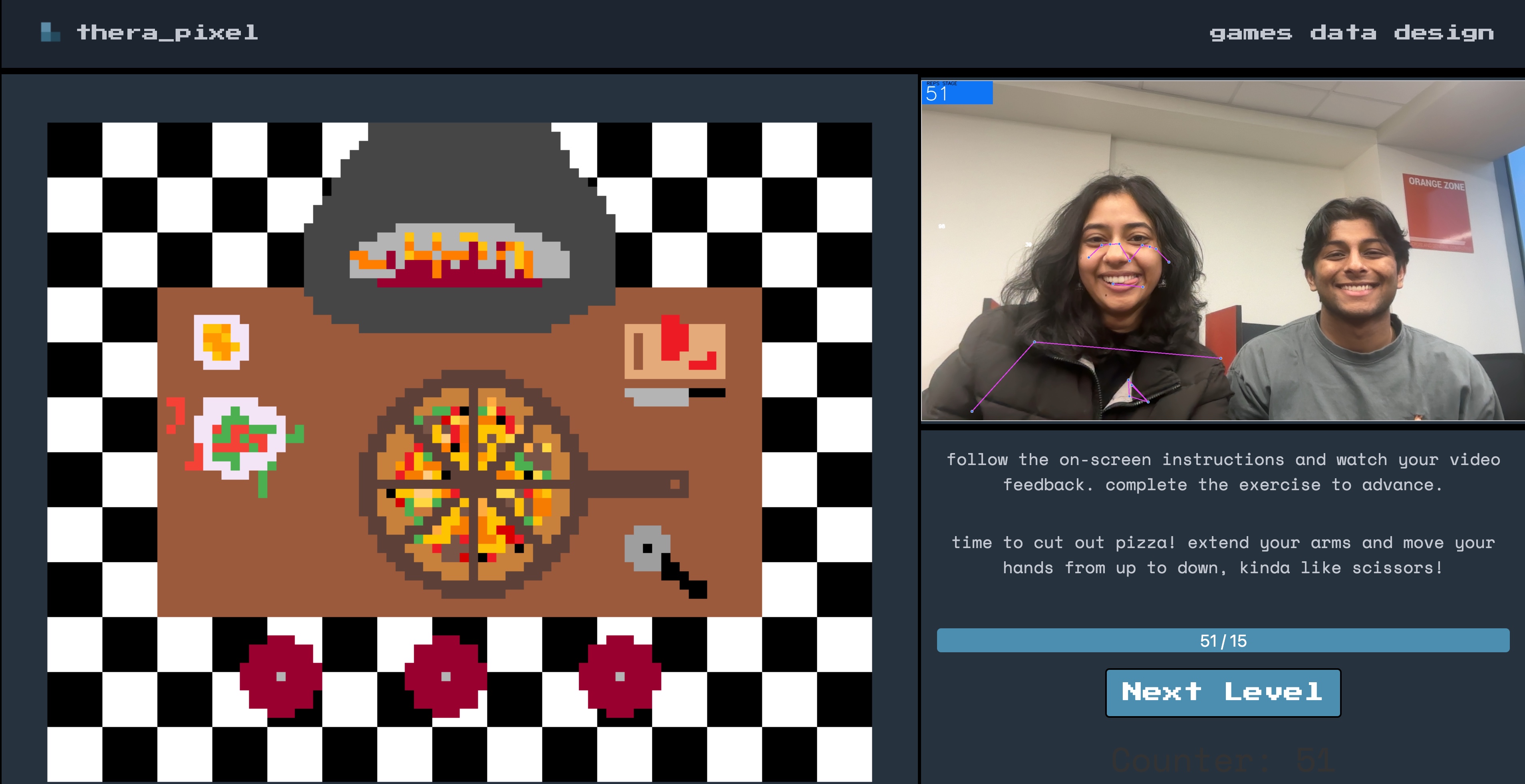 Thera_pixel offers two approaches to gamified physical therapy, one for younger and the other for older audiences. The first approach, Pizza Pursuit encourages patients to emulate upper extremity typically recommended by physical therapists to cook a pizza from rolling the dough all the way to cutting the slices. This game has a live video feed with ML pose detection accompanied by engaging and responsive pixel art visuals showcasing the pizza making process. Our second approach, Practice Studio, allows for patients to focus on perfecting the form and function for common physical therapy exercises, outfitted with real-time feedback to speed up or slow down the repetitions. Practice Studio is designed for older audiences to ensure they progressively overload their recovery safely and effectively.