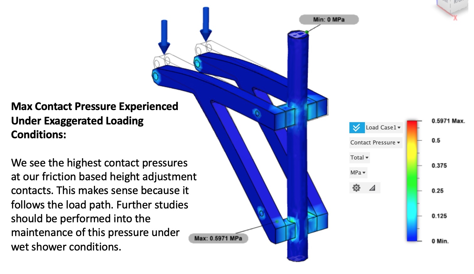 A deep dive into the market showed incredibly expensive alternatives (mainly walk-in showers costing $3k+ and shower seats costing ~$250). The team brainstormed both mechanical and electromechanical solutions to facilitate the bathing process at a price point relative to that of a regular shower head. The team underwent a rapid prototyping process, created multiple MVPs, and then created a CAD model to prepare flow & structural simulations to validate designs. The simulations demonstrate the stress, displace, and contact surface under normal bathing conditions to ensure design integrity. The final prototype allows for the heights at which the water is released to be adjusted, and visual feedback regarding the water temperature was included by integrating a a water-powered turbine inside the design. The water is redirected to be below the user’s head to ensure no loss of senses while showering and to free both hands to support and clean oneself. The design will be seamlessly attached to the location of a typical shower hose to allow for easy installation and adoption into any home.
