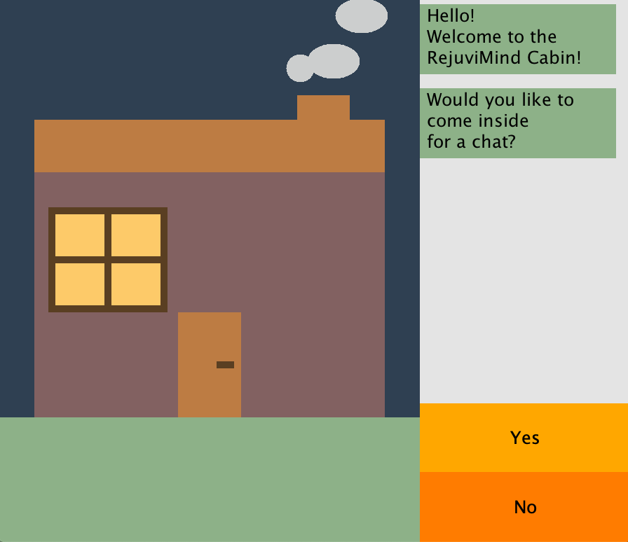 What's next for RejuviMind Cabin I will try to incorporate AI into the chat-box to have more unique and user-centric discussions (rather than the pre-programmed ones I have written down). I'd also like to add more animation and maybe make it seem like the user is really going into the cabin and sitting down. I think it would also be nice to add a timer or animation for the breathing exercises to help guide users as well.