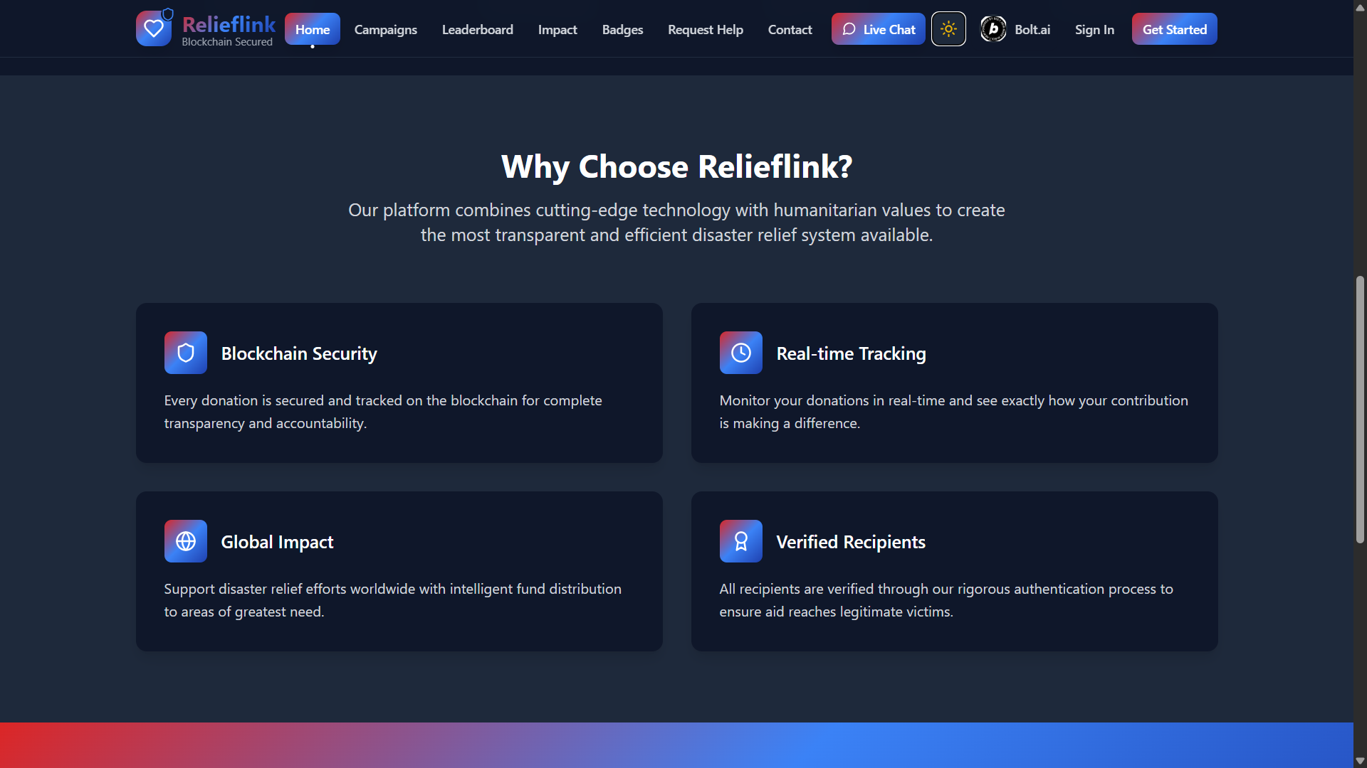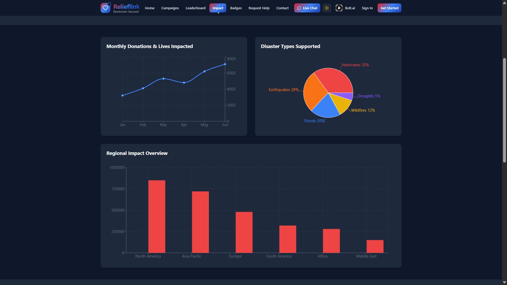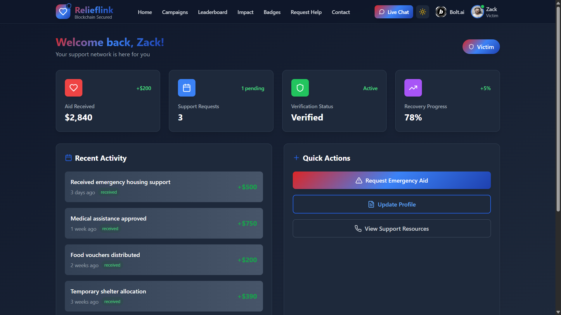 We built ReliefLink with a focus on real-time response, offline usability, and trust through transparent systems. →Frontend: React + TailwindCSS (PWA for offline-first experience) →Backend: Firebase (Realtime DB, Auth, Cloud Functions) →AI Layer: OpenAI API for classifying and prioritizing SOS requests →Mapping: Leaflet.js for live, geotagged disaster maps →Blockchain: Simulated smart ledger for immutable aid trackin