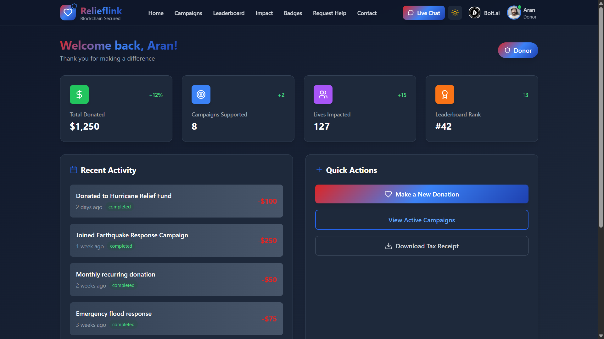 ReliefLink is an AI- and blockchain-powered disaster response platform that enables real-time coordination between victims, verified volunteers, NGOs, and authorities to deliver fast, transparent, and targeted aid during emergencies. At its core, ReliefLink solves the life-threatening delay in disaster response caused by fragmented communication and inefficient resource allocation. It empowers victims to send geotagged SOS alerts through a lightweight app (even offline), which are then instantly analyzed by AI to categorize and prioritize needs—medical, food, shelter, rescue, etc. Meanwhile, all actions—requests, responses, aid transactions—are recorded immutably via blockchain, ensuring transparency, accountability, and trust in how relief is distributed.