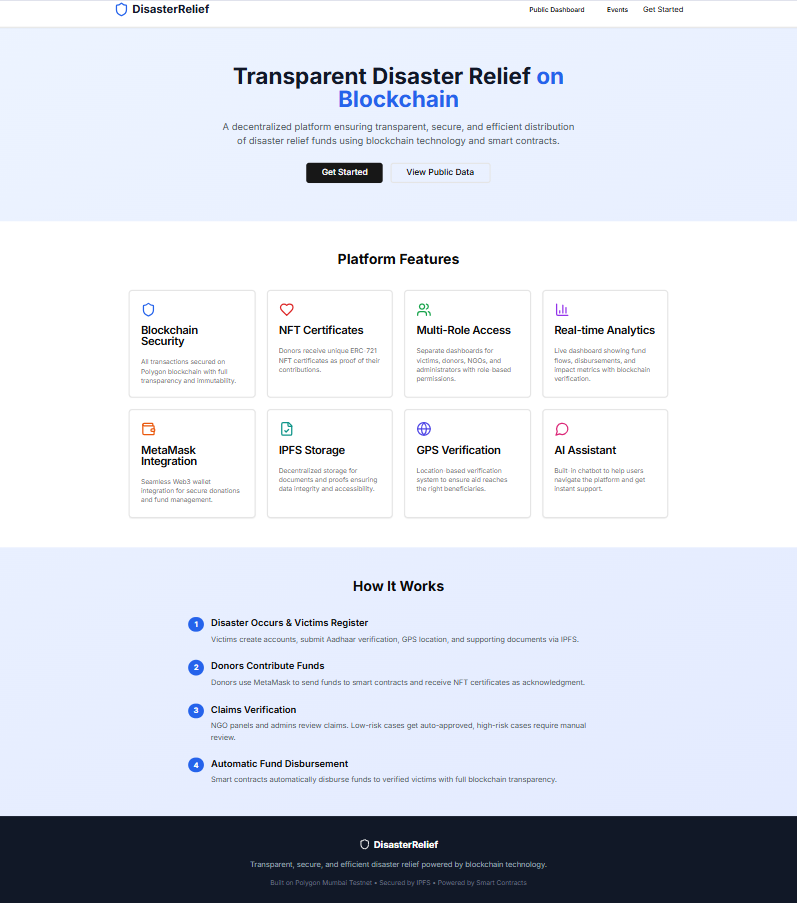 The project was inspired by the recurring challenges faced during urban disasters where victims struggle to access timely aid, and donors lack trust in how their funds are utilized. I wanted to create a decentralized system that ensures transparency, accountability, and fairness in relief fund distribution. Blockchain technology gave me the foundation to achieve this trustless, tamper-proof environment.
