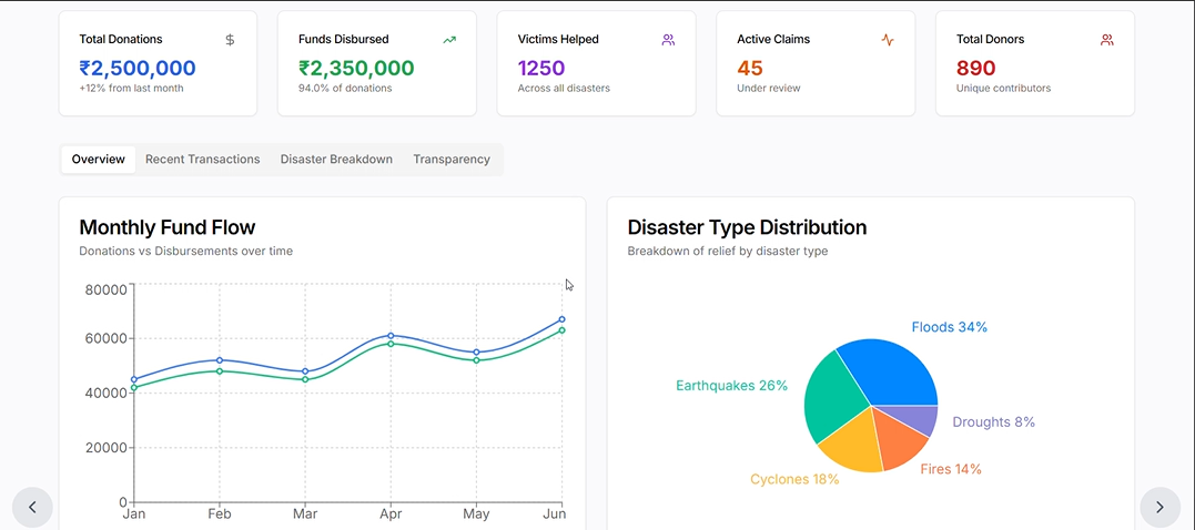 - Dashboards: Real-time analytics built using Recharts for transparency.
